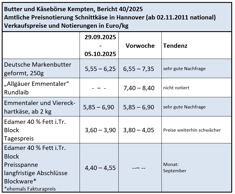 Die sehr lebhafte Nachfrage nach abgepackter Butter vom September hatte häufig auch noch in der ersten Oktoberhälfte bestand. Der Preisanreiz ist für Verbraucher – 90 Cent/250 g Ziegel günstiger als im Vorjahr - offensichtlich groß und das Kaufinteresse noch nicht gesättigt. Die Bestellmengen des Lebensmitteleinzelhandels bewegten merklich über den vergleichbaren Vorjahresmenge. Die Großhandelsabgabepreise an der Süddeutschen Butter- und Käse-Börse in Kempten stabilisierten sich zwischen 5,55 und 6,25 Euro/kg. Der Handel mit Blockbutter verlief dagegen ruhiger und erhielt vereinzelt Impulse. Die seit Ende August rückläufigen Preise beeinflussten den Absatz zuletzt nur bedingt, dürften aber mittelfristig für anziehende Mengenumsätze sorgen.