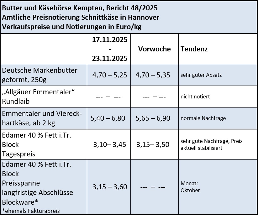 Im Handel mit Schnittkäse stand für die Jahreszeit eine ungewöhnlich hohe Milchmenge zur Verarbeitung. Gleichzeitig waren die Absatzmärkte gut aufnahmefähig. Die Bestellungen aus dem Lebensmitteleinzelhandel erfolgten zügig in umfangreichen Mengen. Ebenso der Absatz im europäischen Umfeld und auch das Kaufinteresse aus Drittländern erfüllte die Erwartungen. Bei einer hohen Auslastung der Käseproduktion standen sich die Marktverhältnisse ausgeglichen gegenüber. Entsprechend kam es kaum zu einem Aufbau der Lagerbestände. Durch das Weihnachtsgeschäft werden erstmals noch anhaltend hohe Mengenumsätze erwartet, für den Jahreswechsel wurden die Erwartungen verhaltener eingestuft.