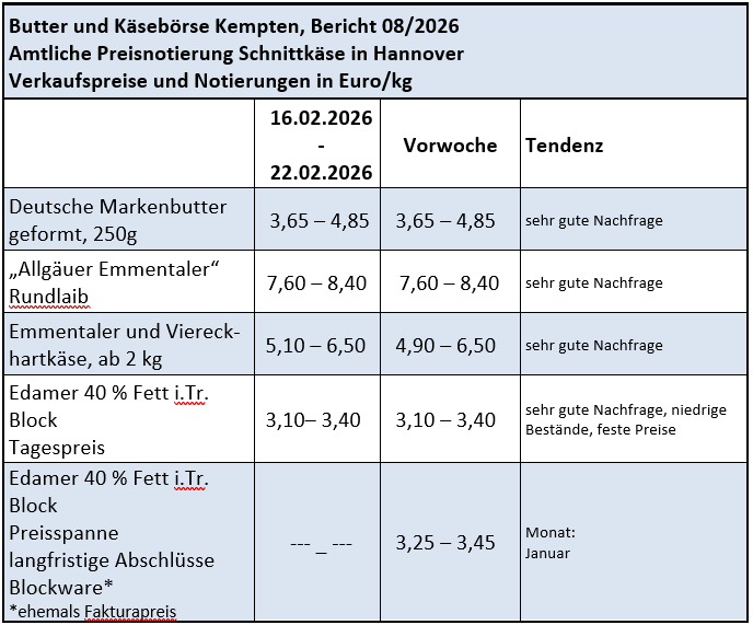 Mit den Mengenumsätzen bei abgepackter Butter war man überwiegend zufrieden, die Bestellungen des Lebensmitteleinzelhandels erfolgten stetig auf gutem Niveau. Im Preiseinstiegssegment kostete Butter mit 0,99 Euro/250g Päckchen im Februar um rund 1,20 Euro weniger als im Vorjahresmonat. Eine Kaufzurückhaltung der Verbraucher aufgrund einer verstärkten Bevorratung zu Jahresende konnte demnach auch nicht festgestellt werden.