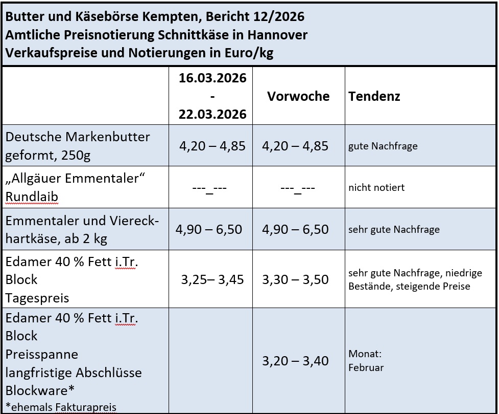 Der Handel mit Butter entwickelte sich unterschiedlich. Im Absatz mit Päckchenbutter prägte eine rege Nachfrage den Geschäftsverlauf. Die Bestellungen legten spürbar zu, aus dem Lebensmitteleinzelhandel wurden zügig hohe Mengen abgerufen. Mit dem bevorstehenden Osterfest wird nochmals eine weitere Belebung der Verbrauchernachfrage erwartet. Die Molkereiabgabepreise tendierten unverändert. Das Handelsgeschäft mit Blockbutter beruhigte sich nach einem für die Jahreszeit sehr lebhaften Absatz zu Monatsanfang. Die anziehenden Kurse hatten möglicherweise die Käufer verunsichert und das Kaufinteresse erhöht. Bei den zuletzt schwächeren Blockbutternotierungen hat sich ein abwartendes Kaufverhalten eingestellt.