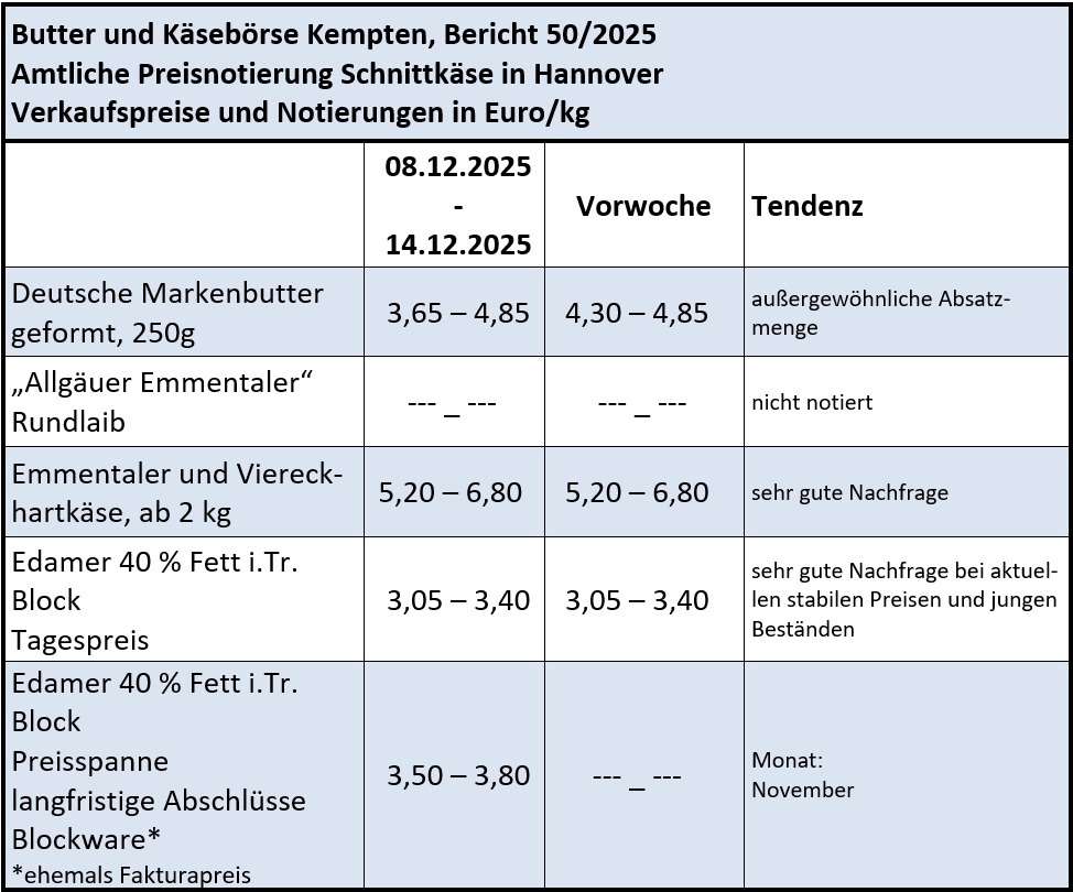 Der Absatz mit abgepackter Butter folgte auch in der ersten Dezemberhälfte der sehr lebhaften Verbrauchernachfrage aus den vorausgegangenen Monaten. Bereits seit September bewegen sich die Verkaufsmengen für Päckchenbutter auf sehr hohem Niveau. Entgegen den Erwartungen hatte die Konsumentennachfrage noch keine Sättigung erreicht und zum Weihnachtsgeschäft hielt der rege Handel an. Demnach konnte mit der sechsten Verbraucherpreisabsenkung für abgepackte Butter im Preiseinstiegssegment im Herbst dieses Jahres auf 0,99 Euro/250g Päckchen die Einkaufsbereitschaft der Verbraucher stimuliert werden. Bleibt abzuwarten, wie sich das Kaufverhalten nach den Feiertagen entwickelt. Unter den Vorgaben der Discounter standen die Abgabepreise der Molkereien unter anhaltendem Preisdruck, die Notierungen in Kempten verzeichneten einen weiteren Rückgang für abgepackte Ware. In der Untergrenze gaben die Preise 0,65 Euro auf 3,65 Euro/kg nach und unterschritten erstmals wieder die Marke von 4,00 Euro. Blockbutter nahm hingegen eine stabile Entwicklung.