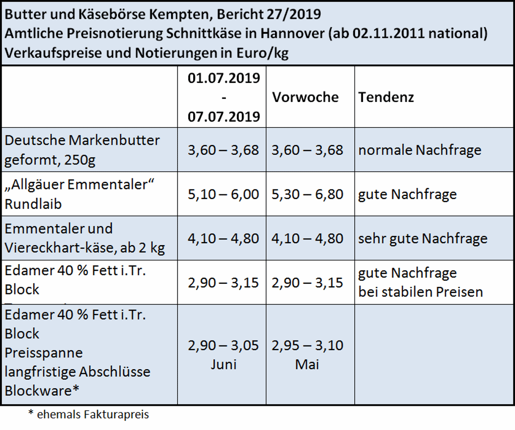 Trotzdem in vielen deutschen Bundesländern die Schulferien begonnen haben und somit eine höhere Reisetätigkeit erfolgt, kann sich der Absatz von Schnittkäse auf einem für die Jahreszeit hohen Stand präsentieren. Allgemein werden die verfügbaren Käsesorten vom Handel rege geordert, so dass der Inlandsabsatz als gut einzustufen ist. Ebenfalls, mit höheren Verkaufssequenzen und einem gutem Bestelleingang, gehen die Exportgeschäfte zügig voran. Obwohl die Käseproduktion in den letzten Wochen aufgrund des regen Bedarfs erhöht wurde, bleibt die Angebotssituation zumeist ausgeglichen, so dass generell eine unveränderte Preishöhe genannt werden kann.