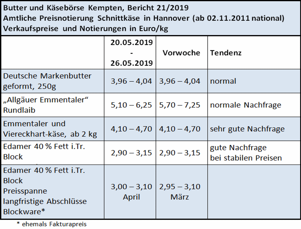 Wie erwartet, gehen die Absatzmengen von Schnittkäse kurz vor den Pfingstferien tendenziell wieder nach oben. Nicht nur ein guter Inlandsbedarf ist zu beobachten, sondern auch der Exportabsatz, vor allem in die Anrainerstaaten des Mittelmeeres, konnte erhöht werden. Die Produktion von Schnittkäse ist der aktuellen Nachfragetendenz größtenteils angeglichen worden, so dass sich die Erlöse mehr oder weniger auf den Werten der Vorwoche eingependelt haben.