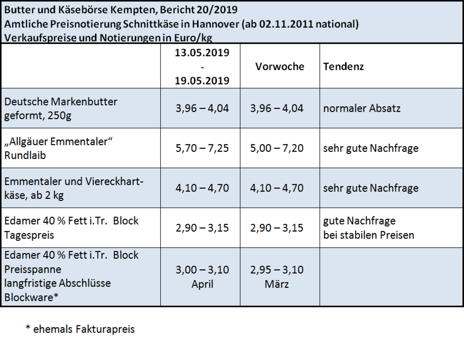 Die Hartkäsemengen zeigen sich unbeeindruckt von der kühlen Witterung. Im Bereich der Emmentaler Rundlaibe, wie auch der Block- und Stückware, sind gute Verkaufsmengen festzustellen. Aufgrund dessen erweisen sich die Verkaufszahlen im Inland gut gestärkt. Im Ausland werden allerdings aktuell eher weniger Umsätze gemeldet. Da beim Wechsel in das 2. Quartal 2019 die Preise von Emmentaler im Discounterbereich leicht zurückgegangen sind, haben auch die Verkaufserlöse im Blockbereich momentan geringfügige Rückgänge hinnehmen müssen. Auf dem Weichkäsemarkt zeigt sich, entgegen dem saisonalen Trend, eine gute Absatzstimmung. Hier bleibt die Erlösbasis weiterhin fest.