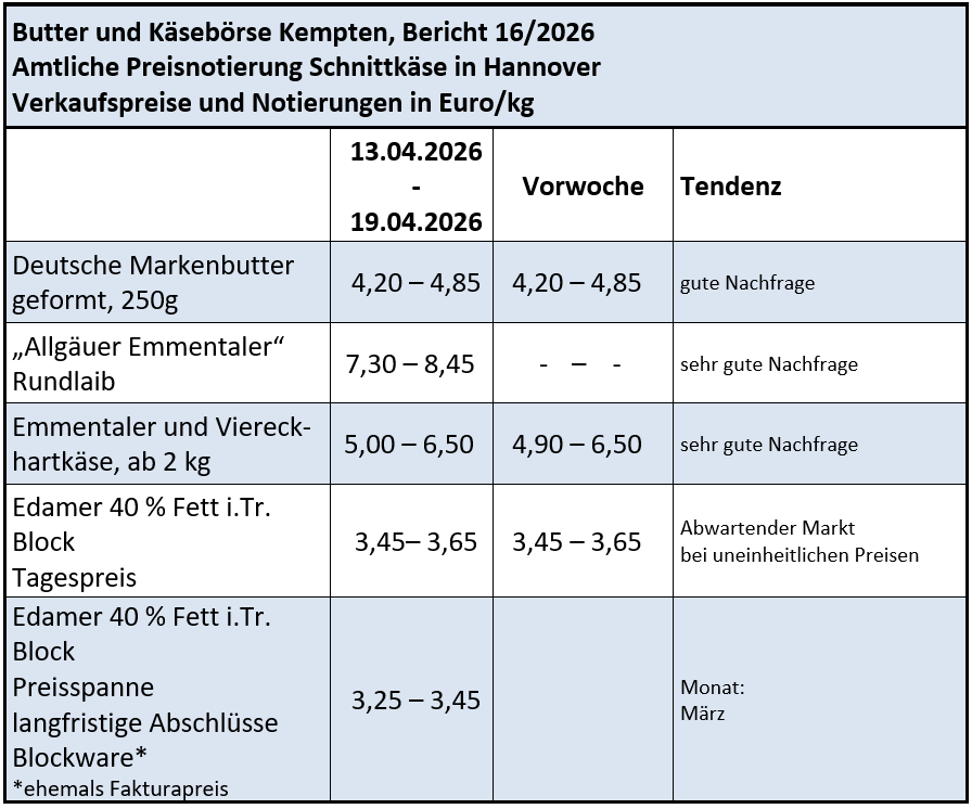 Der Handel mit Schnittkäse wurde auch nach dem Ostergeschäft von einer anhaltend hohen Nachfrage geprägt. Die nationalen Bestellungen aus dem LEH wurden rege abgerufen, was für ein hohes Kaufinteresse der Verbraucher spricht. Mit den abgerufenen Mengen aus der Industrie und der Gemeinschaftsverpflegung war man zufrieden. Die Lieferungen an die Gastronomie stand in Abhängigkeit des Witterungsverlaufs und dürften saisontypisch Impulse erhalten. Anziehender Bedarf wird auch für das Exportgeschäft im europäischen Binnenmarkt erwartet. Der hohen Nachfrage stand angesichts des umfangreichen Rohmilchaufkommens eine ausgereizte Käseproduktion gegenüber. Dennoch konnten die nachgefragten Mengen nicht immer vollständig bedient werden. Die Preisentwicklung auf Großhandels- und Verbraucherebene nahm Mitte April ein konträres Bild ein. Während zuletzt die Tagespreise für Schnittkäse ab Werk eine feste Preisentwicklung einnahmen, senkten maßgebende Discounter die Verbraucherpreise für Käse.
