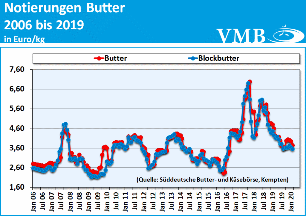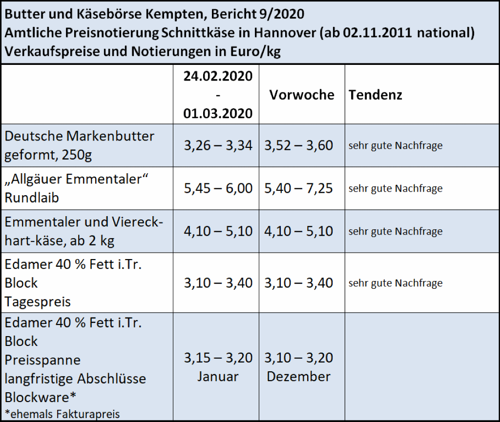 Die Absatzentwicklung bei Butter bleibt für die Jahreszeit immer noch auf einem freundlichen Niveau. Der Absatz von Butter-Stückware als auch der Blockware, präsentiert sich als sehr angeregt und weist gute Verkaufszahlen auf. Die Butterpreise zeigen sich noch etwas undeutlich in ihrer Entwicklung. Während die Butterstücke im März preislich durch die Kontrakte unter Druck geraten sind, offenbaren sich im Blockbutterbereich bessere Verwertungen. Demzufolge befinden sich die Erlöse leicht über denen der geformten Ware. Da allerdings die anhaltenden negativen Folgeerscheinungen des Coronavirus den Handel auf dem Milchsektor einschränken, werden durchwegs beim Tagesgeschäft die Rahmpreise zurückgenommen.