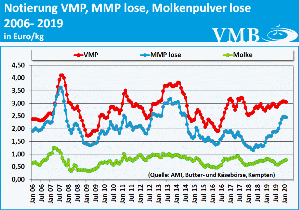 Die Milcherzeugungsmenge in Deutschland wächst weiter saisonal bedingt an. Das Milchaufkommen wird, aufgrund der milden Temperaturen noch früher als erwartet, den saisonalen Höhepunkt zu Frühjahresbeginn erreichen. Ebenso nehmen im Inland die Vermarktungsmöglichkeiten bei allen Standardprodukten zu und weisen eine freundliche Tendenz, mit gefestigtem Preisgefüge auf. Mitunter haben jedoch teilweise die stattgefundenen Hamsterkäufe auch Auswirkungen auf den inländischen Milchabsatz. Außerdem wird der heimische Marktverlauf gegenwärtig zusätzlich vom globalen Sektor sehr stark negativ geprägt. Die epidemischen Vorgaben und die daraus erfolgenden Handelseinschränkungen, setzen die globale Vermarktung zunehmend unter Druck. Diese Ereignisse zeigen schon erste Auswirkungen bei der Vermarktung von Milchpulver. Dennoch kann in der derzeitigen Phase das Geschäft mit Milchpulver noch als gut eingestuft werden. Zum Teil sind auf dem heimischen Markt aber auch leichte Preisrückgänge festzustellen.