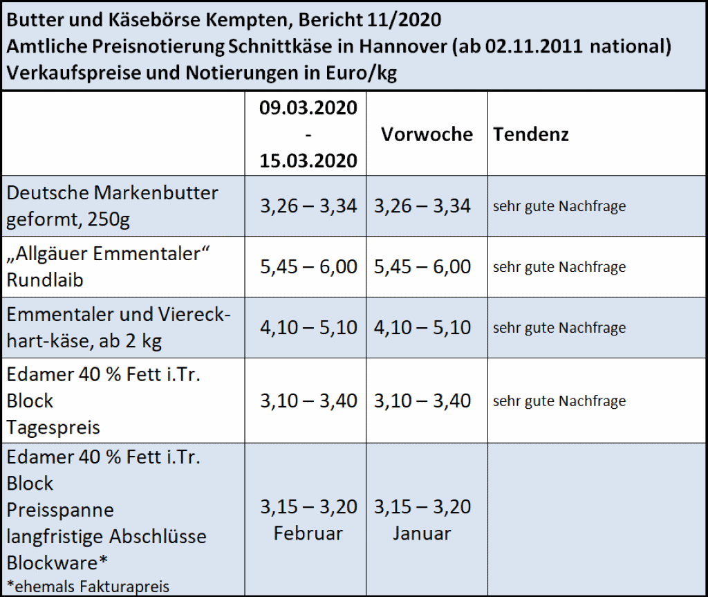 Der Verkauf von Hartkäse geht überwiegend normal voran. Im Inlandsgeschäft werden Allgäuer Emmentaler, Blockware aber auch Hartkäsestücke ohne große Verkaufsimpulse abgesetzt. Ebenfalls hat auch die Nachfrage im Lebensmitteleinzelhandel sich normalisiert. Weiterhin eingeschränkt bleibt der Verkauf über die Landesgrenzen hinaus. Diese Marktsituation wird sich in den nächsten Wochen auf gleichem Niveau fortsetzen, da inzwischen auch andere EU-Staaten ihren Warenverkehr beschränkt haben. Dennoch präsentieren sich die Erlöse weiterhin auf einem festen Niveau.