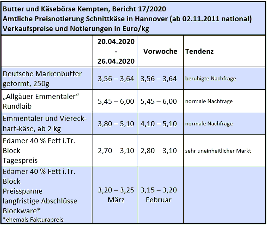 Der Handelsumfang von Butter erweist sich in der Berichtswoche als relativ niedrig. Dies liegt einerseits daran, dass das beschränkte Zeitfenster der Osterfeiertage immer noch die Einkaufsmenge beeinflusst hat. Andererseits sind im Bereich der Blockware die Handelstätigkeiten nach wie vor durch die Pandemie-Einschränkungen begrenzt. Durch die Beschränkungen ist vor allem der Absatz in der Gastronomie wie auch der Einkauf von Betrieben die Lebensmittel bzw. Milchprodukte weiterverarbeiten weggebrochen. Der Rahmverkauf für die privaten Haushalte offenbart sich als relativ freundlich, da durch das schöne Wetter und der beginnenden Saison für Gemüse und Früchte, wieder der Bedarf von Rahm und Sahne ansteigt. Dennoch bleibt die Preisfindung zweigeteilt, so dass bei Rahm wie auch bei Blockbutter die Erlöshöhe weiterhin sehr massiv diskutiert wird. Die Preise von Butter-Stückware haben sich aufgrund des guten Absatzniveaus fester positionieren können.