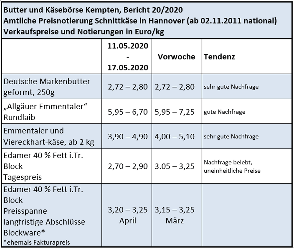 Die Hartkäsevermarktung der Allgäuer Emmentalersorten, bleibt größtenteils weiter auf den Inlandsmarkt beschränkt. Vor allem im Discouterreich gehen nach wie vor freundliche Mengen über die Ladentheke. Allerdings ist der Absatz von Allgäuer Emmentaler aller Qualitätsstufen im Großhandelsbereich, zuständig für den Gastronomiebedarf, noch begrenzt. Desgleichen sind die gemeldeten Exportzahlen, da wenn überhaupt möglich,die Ausfuhr nur in die EU-Nachbarstaaten erfolgen kann, noch relativ gering. Trotz dieser angespannten Vermarktungssituation lassen sich im Emmentaler-Segment feste Preise nennen.