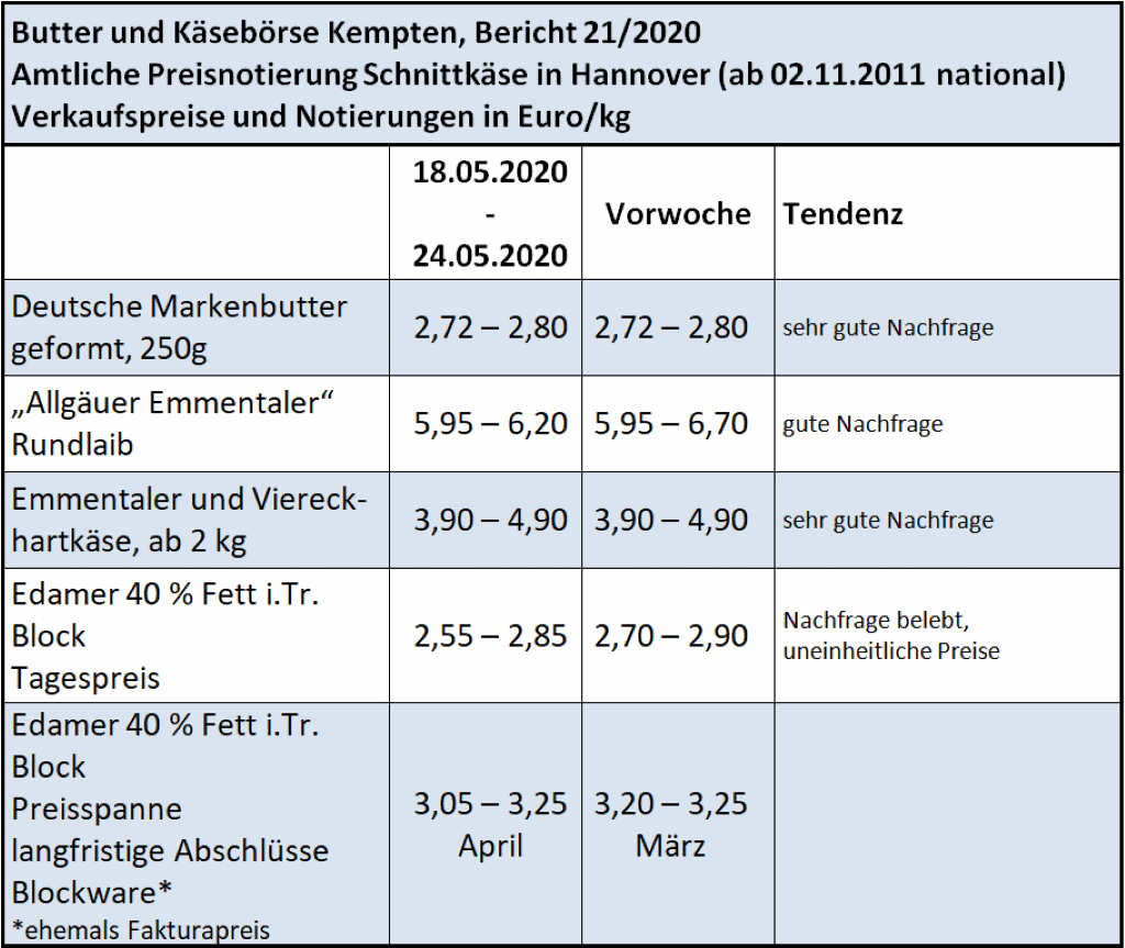 Vor den Feiertagen, aber möglicherweise auch wegen den guten Absatzmöglichkeiten von Milchfett für das Sommergemüse und Früchte, offenbart sich der Bedarf als ansteigend. Die Rahmpreise haben in den letzten beiden Wochen ihr Tal durchschritten und zeigen nun wieder einen aufsteigenden Trend auf. Entsprechend dieser Entwicklung und aufgrund des guten Mengenabsatzes, liegen die Preise der Blockbutter teilweise über dem Erlösniveau der Stückware. Die geformte Ware konnte ebenfalls eine gute Nachfrage erreichen, allerdings befindet sich der Preis, aufgrund der für diesen Monat ausgehandelten Preisbindung, noch auf dem vereinbarten Ergebnis. Noch ungewiss ist daher, wie die nächste Kontrakthöhe mit dem Lebensmitteleinzelhandel ausfallen wird, da die Marktpreise von Rahm und Blockbutter über den Discounterpreisen liegen.