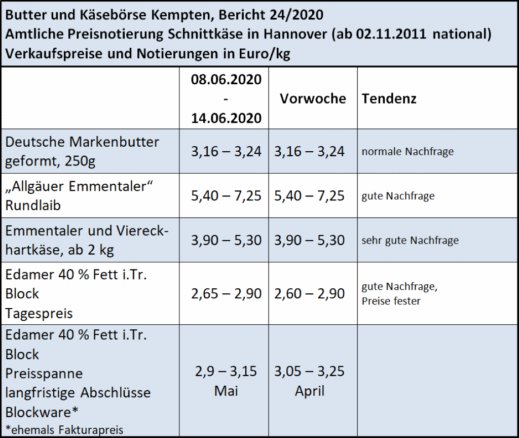 Es ist zwar irgendwie kurios, dass jetzt, obwohl der Schulbesuch aufgrund der Corona-Krise seit Ostern stark eingeschränkt erfolgte, nun dennoch am Monatsende die Schulferien in Deutschland beginnen. Dies führt im Hartkäsebereich dazu, dass die Absatzsituation sich überwiegend eher nur normalisiert hat und keine großen Verkaufsimpulse stattfinden. Die Auslandsgeschäfte verlaufen allmählich wieder etwas freundlicher, können aber noch nicht ganz an die gewohnten Umschlagshöhen heranreichen. Dennoch trägt auch der leicht angestiegene Export zur Marktentlastung bei, so dass das Preisniveau zu fester tendieren kann.