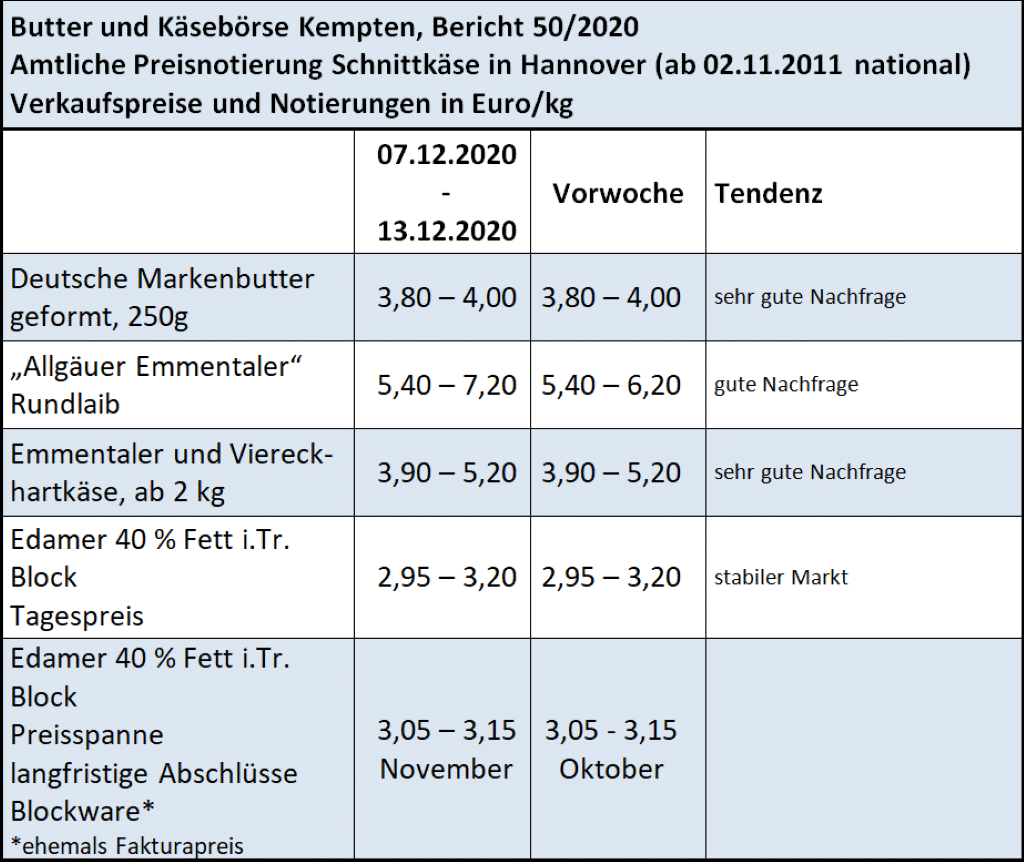 Nachdem die Weihnachtsfeiern und Silvesterpartys mehr oder weniger zu Hause stattfinden werden, ist das Kaufinteresse der deutschen Privathaushalte an Käse allgemein angestiegen. Im Hartkäsesegment werden die Spezialitäten Allgäuer Emmentaler und Allgäuer Bergkäse wie auch die Emmentaler Viereckware rege geordert. Ebenfalls erweist sich das Umsatzniveau der abge-packten Ware im 400-gr-Stück-Bereich bzw. im Scheibenbereich als sehr ausgeprägt. Kurz vor den Feiertagen haben sich die Exportmöglichkeiten vor allen in die benachbarten EU-Staaten erhöht. Das Marktgeschehen zeigt sich bei Hartkäse zumeist als ausgeglichen, so dass mehr oder weniger unveränderte Konditionen genannt werden konnten.