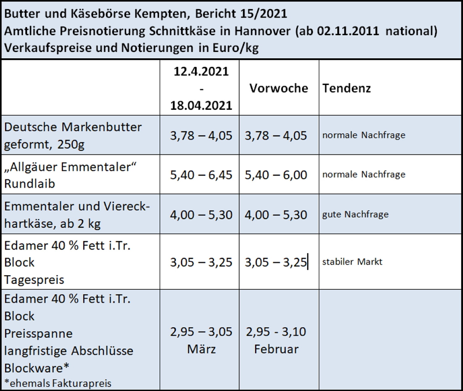 Die Corona-Pandemie verschafft der Vermarktung von Schnittkäse, vor allem über den Lebensmitteleinzelhandel, weiteres Marktpotenzial. Im Schnittkäsesegment werden weiterhin, auch nach den Osterfeiertagen, rege Mengen geordert. Vor allem gehen immer noch, neben den bestehenden Verkaufsmöglichkeiten im Lebensmitteleinzelhandel (LEH), auch die Außenhandelsgeschäfte gut voran. Trotz des guten Vermarktungsniveaus zeigt sich hier das Preisgefüge noch abwartend, so dass trotz einer ausgeglichenen Marktlage, die als notwendig erachtenden Preiserhöhungen nur allmählich festzustellen sind.