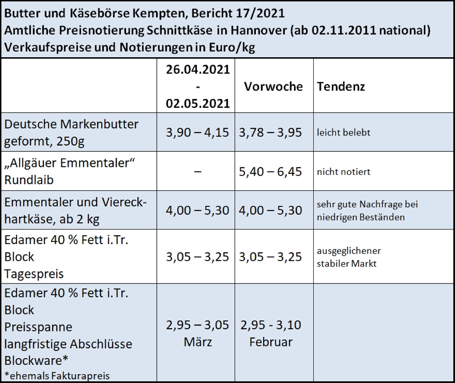 Im Vergleich zur Vorwoche, weist die Umsatzentwicklung bei Hartkäse ebenfalls Verbesserungen auf. Im Inland wird neben Allgäuer Emmentaler Block- und Rundlaibe auch Viereckware gut nachgefragt. Vor allem vom Lebensmitteleinzelhandel werden weiterhin stetig gute Mengen geordert. Deshalb offenbart sich die Marktstimmung als sehr ausgeglichen, so dass von Seiten der Hersteller feste Preise genannt werden können.