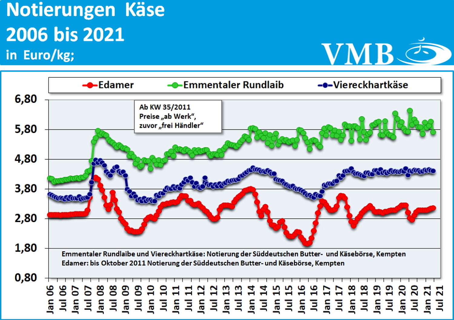 Der Handel mit Hartkäse, in Form von Allgäuer Emmentaler Rund- und Blockware wie auch mit Emmentaler Viereckware, hat im jahreszeitlichen Vergleich, etwas an Vermarktungsimpuls verloren. Vor allem über den Großhandel zeigen die Absätze immer noch ein verhaltenes Einkaufsverhalten an, während dagegen im Lebensmitteleinzelhandel ein etwas größeres Kaufinteresse besteht. Summarisch erweist sich die Verkaufsmenge dennoch als vergleichsweise normal für diese Jahreszeit. Die Exportgeschäfte offenbaren sich im Hartkäsebereich gleichfalls als abwartend, wobei durch die Lockerungen der Pandemie-Vorgaben in vielen beliebten Urlaubsregionen am Mittelmeer, die Hoffnung der Käsehersteller besteht, in den kommenden Tagen größere Anfragen zu erhalten. Die Preise befinden sich weiterhin auf einem gleichbleibenden Niveau.