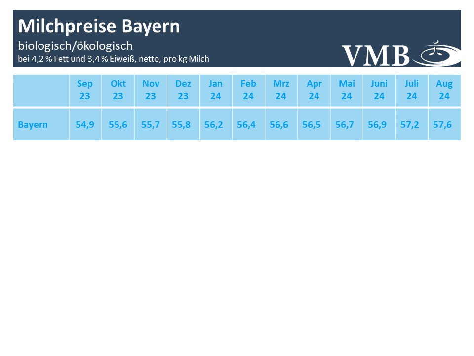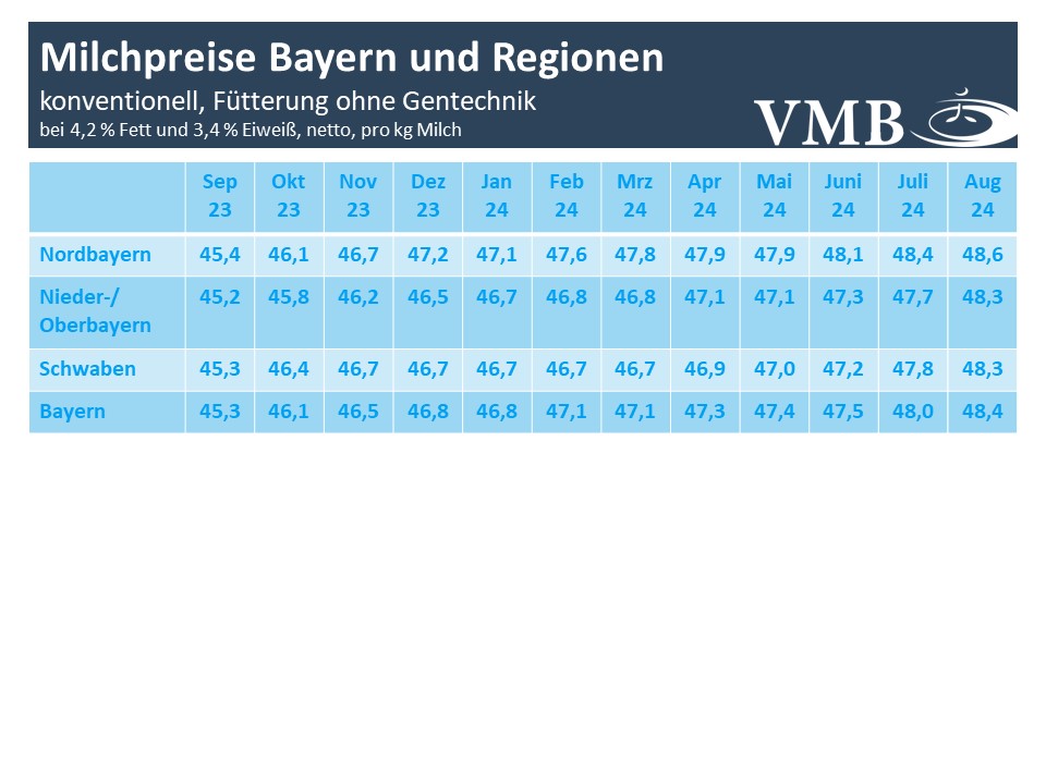Nachdem im Juli die bayerischen Milchpreise bereits zu einem festeren Preistrend angesetzt haben, erhöhten im August vermehrt bayerische Molkereien die Auszahlungsleistung. Insbesondere in den Erfassungsgebieten Nieder-/Oberbayern und Schwaben waren die Preisanhebungen am deutlichsten ausgeprägt. Im bayerischen Mittel erhöhte sich der Milchpreis laut Berechnungen des Verbands der Milcherzeuger in Bayern (VMB) auf 48,4 Cent pro Kilogramm Milch (bei 4,2 % Fett, 3,4% Eiweiß netto ab Hof bei Haltungsstufen 2 falls ausgewiesen), ein leichtes Plus von 0,4 Cent. Die Auszahlungspreise von vor zwölf Monaten werden um gut 3 Cent/kg Milch übertroffen.