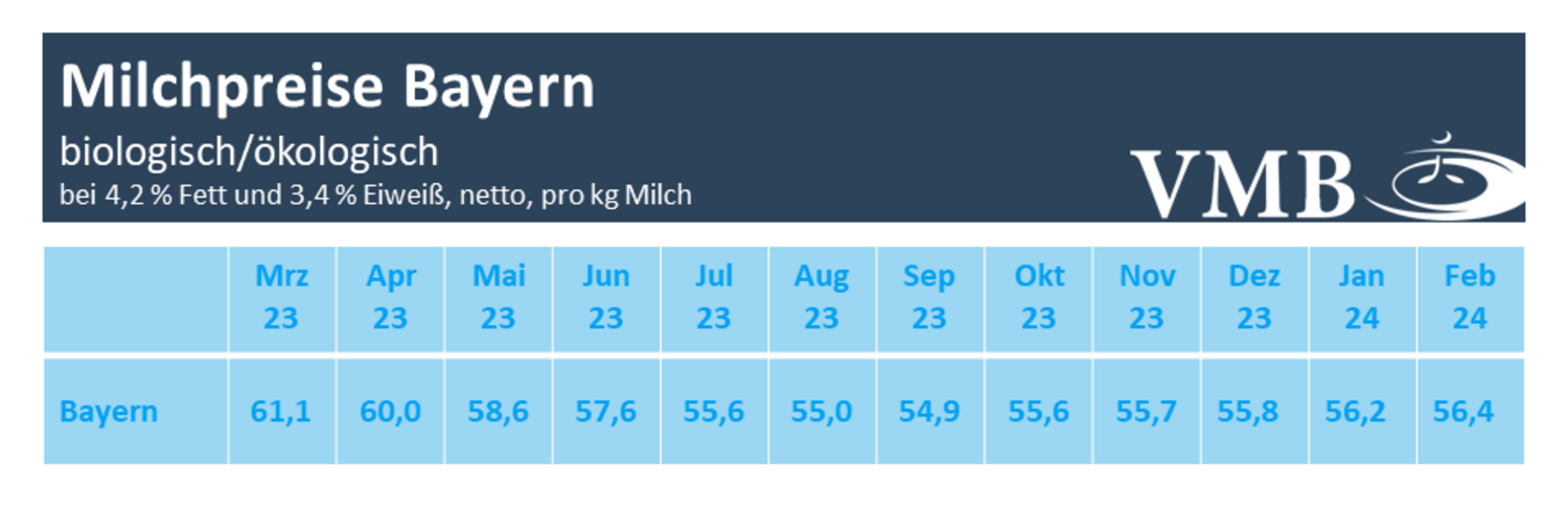 Die Vermarktung an Biomilcherzeugnisse fußt mittlerweile auf einer stabileren Basis. Durch die letztjährig abgesenkten Verkaufspreise haben nun wieder die Konsumenten den Griff zu Biomilchprodukten erhöht. Gleichzeitig konnten sich auch die Verkaufspreise in einem gewissen (kleineren) Umfang anpassen, so dass die Verwertung der Biomilch anstieg. Im Februar 2024 erhöhte sich der Preis für ökologisch/biologische Milch vom Vormonat (korrigierter Wert!!) mit 56,2 Cent/kg Milch um 0,2 Cent auf 56.4 Cent/kg Milch. Ähnlich wie bei der Milchvermarktung im konventionellen Bereich werden wahrscheinlich in nächster Zeit nur Nuancen an Milchpreisverbesserungen stattfinden, da auch hier neuere Konditionen erst zur Jahresmitte hin, verhandelt werden.