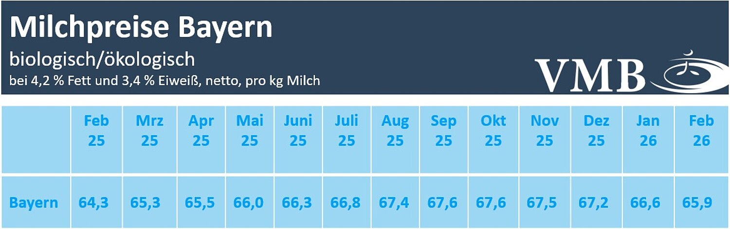 Die Vermarktung von Biomilch hatte im Vergleich zum konventionellen Milchmarkt eine robustere Entwicklung genommen. Entsprechend deutlich war auch der Preisabstand ausgefallen, der sich im Februar im bayerischen Durchschnitt auf 25,2 Cent/kg erhöhte. Nach einer aktuellen Auswertung vom VMB bewegte sich im Februar die bayerische Auszahlungsleistung für Biomilch im Mittel bei 65,9 Cent/kg Milch (bei 4,2 % Fett, 3,4 % Eiweiß, netto ab Hof). Zum Vormonat bedeutet das eine Korrektur von durchschnittlich 0,7 Cent/kg. Mit den ersten Korrekturen seit Oktober reduzierten sich die bayerischen Biomilchpreise um 1,7 Cent/kg. Das Niveau vom Februar des vergangenen Jahres konnte dabei um 1,6 Cent/kg Milch übertroffen werden.