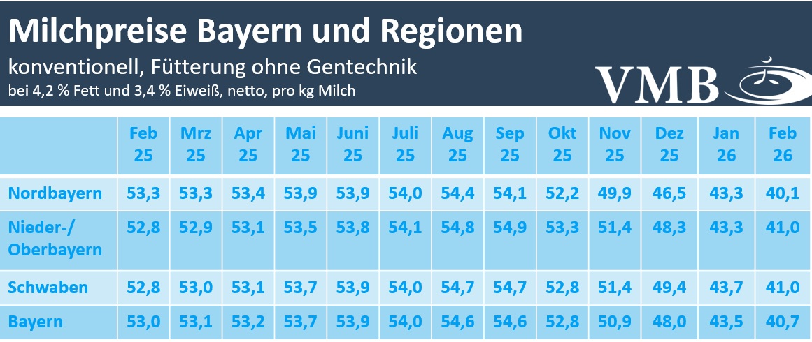 Auf den drastischen Preisrutsch im Januar folgte im zweiten Monat des laufenden Jahres ein erneuter Rückgang der Milchpreise in Bayern. In der aktuellen Erhebung vom Verband der Milcherzeuger in Bayern (VMB) verloren die Milchauszahlungspreise im Februar um durchschnittlich 2,8 Cent auf 40,7 Cent/kg Milch (bei 4,2 % Fett, 3,4 % Eiweiß, netto ab Hof bei Haltungsstufen 2, falls ausgewiesen). Seit September 2025 sind die bayerischen Milchpreise somit um 13,9 Cent/kg eingebrochen und liegen aktuell 12,3 Cent unter der Auszahlungsleistung des Vorjahresmonats. In den ausgewiesenen Regionen wurden die Milchpreise in Nordbayern um durchschnittlich 3,2 Cent auf 40,1 Cent/kg Milch abgeschlagen. Im Erfassungsgebiet Nieder-/Oberbayern bewegten sich die Auszahlungsleistungen im Mittel bei 41,0 Cent/kg Milch, was einen Rückgang von 2,3 Cent gegenüber dem Januar bedeutet. Für Schwaben wurde ebenfalls ein durchschnittlicher Milchpreis von 41,0 Cent/kg Milch ermittelt. Das Niveau des Vormonats wurde somit um 2,7 Cent unterschritten.