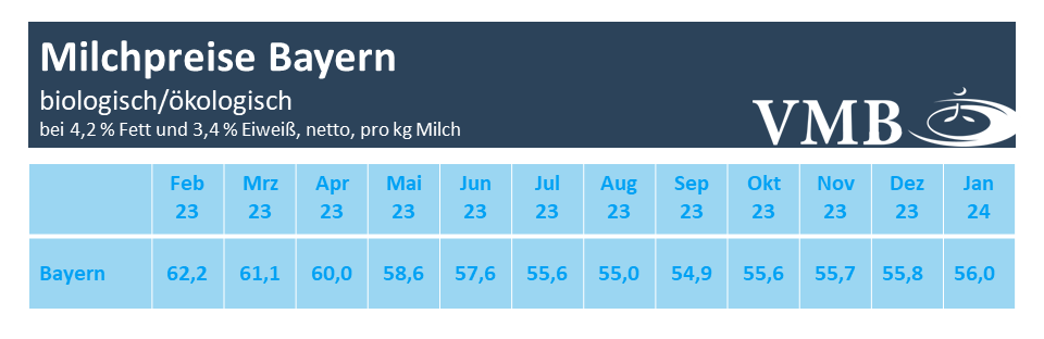 Die Absätze für Biomilcherzeugnisse haben – zum Teil wegen gesenkter Abgabepreise – zum Jahresstart etwas zulegen können. Diese kontinuierliche und feste Marktentwicklung für Biomilch ermöglichte es, bei einigen Molkereien wieder leichte Milchpreiserhöhungen an die Biomilcherzeuger weiterzugeben. Der durchschnittliche Biomilchpreis für Januar 2024 beträgt nun 56,0 Cent/kg Biomilch und konnte somit um 0,2 Cent zum Dezember 2023 zulegen. Da gleichfalls die Vermarktung für Bioerzeugnisse - wie im konventionellen Bereich - eine feste Substanz aufweist, werden auch hierzu die weiteren Preisausrichtungen ohne viele Schwankungsdifferenzen im ersten Jahresdrittel ausfallen.