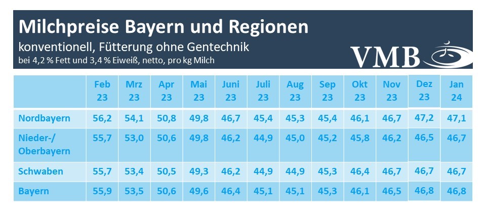 Die Marktkonstellation für Milcherzeugnisse hat sich nach dem Jahreswechsel weiter auf dem Niveau der vergangenen Monate fortgesetzt. Die Verkaufspreise hierzu sind fast ohne Veränderungen ins neue Jahr gestartet, so dass die Auszahlungsleistungen der Molkereien fast ohne Korrekturen auch im Januar 2024 folgten. Nur im „Innenverhältnis“ haben sich leichte Veränderungen ergeben, dennoch kann momentan von einer sehr festen Seitwärtsbewegung hinsichtlich Milchpreis und Handelspreise für Milchprodukte ausgegangen werden. Der VMB hat für den Januar 2024 in Bayern einen durchschnittlichen gewichteten Milchpreis von 46,8 Cent pro Kilogramm (bei 4,2 % Fett, 3,4 % Eiweiß, netto ab Hof bei Haltungsstufen 2 falls ausgewiesen) errechnet. Die Auszahlungsspannen in den drei bayerischen Gebieten haben sich allerdings leicht gegensätzlich zum bayerischen Mittelwert entwickelt. Während die Auszahlungsleistung in Schwaben zum Vormonat mit 46,7 Cent/kg Milch unverändert blieb, reduzierte sich der nordbayerische Durchschnitt um 0,1 Cent auf 47,1 Cent/kg Milch. Die einzige Preiserhöhung erfolgte in der Region Nieder-/Oberbayern. Für diese Region wurde eine Verbesserung von 0,2 Cent auf einen Wert von 46,7 Cent/kg Milch ermittelt. Da die derzeitigen Marktbedingungen durch eine freundliche Nachfragesubstanz und einer nachlassenden Milchanlieferung geprägt sind, werden sich aller Voraussicht nach im ersten Jahresquartal 2024 keine wesentlichen Änderungen mehr ergeben. Aber die derzeitig zum Teil sehr verzwickten politischen Entwicklungen in Deutschland und Europa bzw. die immer noch kriegerischen Auseinandersetzungen im Nahen Osten und Osteuropa, lassen Zukunftsprognosen immer nur noch kurzfristig abschätzten.
