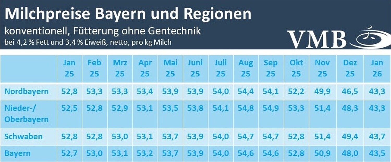 Mit dem Milchgeld für Januar kam der Preisdruck nun verstärkt auch bei den bayerischen Milcherzeugern an. Gegenüber dem Vormonat kam es häufig zu einem außergewöhnlichen Preisrutsch, die Milchpreise wurden bis zu 10 Cent/kg abgeschlagen. Der Verband der Milcherzeuger in Bayern (VMB) ermittelte für Januar einen durchschnittlichen Milchpreis von 43,5 Cent/kg (bei 4,2 % Fett, 3,4 % Eiweiß, netto ab Hof bei Haltungsstufen 2 falls ausgewiesen). Das bedeutet einen Rückgang von 4,5 Cent/kg gegenüber den Dezember-Milchpreisen. Der Preisrückgang fiel damit deutlich stärker aus als im Monat zuvor, als ein Minus von 2,9 Cent/kg entstand. Zum Jahresstart 2026 unterschreiten die bayerischen Milchauszahlungspreise die Vorjahrespreise um gut 9 Cent/kg Milch und bewegen sich auf dem niedrigsten Stand seit Januar 2022. Der zuletzt große Preisabstand innerhalb der einzelnen bayerischen Erhebungsgebieten glich sich im Januar nahezu wieder an. In der Region Schwaben wurden die Milchpreise am deutlichsten reduziert (-5,6 Cent/kg) auf 43,7 Cent/kg Milch. Mit einem durchschnittlichen Auszahlungspreis von 43,3 Cent/kg lagen in Nieder-/Oberbayern und Nordbayern die Milchpreise gleich auf, wenn gleich in Nordbayern der Rückgang mit 3,2 Cent/kg geringer ausfiel als in Nieder-/Oberbayern mit 5,0 Cent/kg.