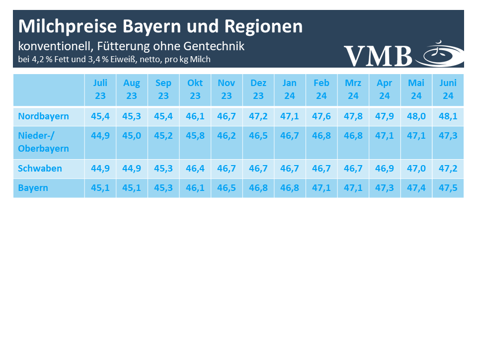 Zur Jahresmitte wurde die Entwicklung der bayerischen Auszahlungspreise für konventionelle Kuhmilch von einer anhaltenden Stabilität geprägt. Gebietsweise zogen die Einkaufspreise der Molkereien in ersten Schritten etwas an. Im bayerischen Durchschnitt erhielten die Milcherzeuger im Juni, nach Berechnungen des Verbands der Milcherzeuger in Bayern (VMB), 47,5 Cent pro Kilogramm Milch (bei 4,2 % Fett, 3,4 % Eiweiß netto ab Hof bei Haltungsstufen 2 falls ausgewiesen) ausbezahlt. Gegenüber dem Vormonat verbesserte sich das Auszahlungsniveau im bayerischen Mittel moderat um knapp 0,2 Cent. Im Verlauf der ersten sechs Monate des vergangenen Jahres standen die Milchpreise unter starkem Preisdruck. Vor diesem Hintergrund übertreffen die bayerischen Auszahlungspreise nun im Juni das Vorjahresniveau um gut einen Cent.  Innerhalb der ausgewiesenen Regionen verbesserten sich die Milchpreise in Nordbayern von 48,0 auf 48,1 Cent/kg. Für die Region Nieder-/Oberbayern errechnete sich ein leicht höheres Plus von 0,2 Cent, es wurden im Schnitt 47,3 Cent/kg Milch ausbezahlt. In Schwaben erreichten die Milchpreise bei einer identischen Preisanhebung ein Durchschnittsniveau von 47,2 Cent/kg Milch. Von Januar bis Juni dieses Jahres erhöhten sich die durchschnittlichen Auszahlungspreise in Bayern um 0,7 Cent/kg Milch.