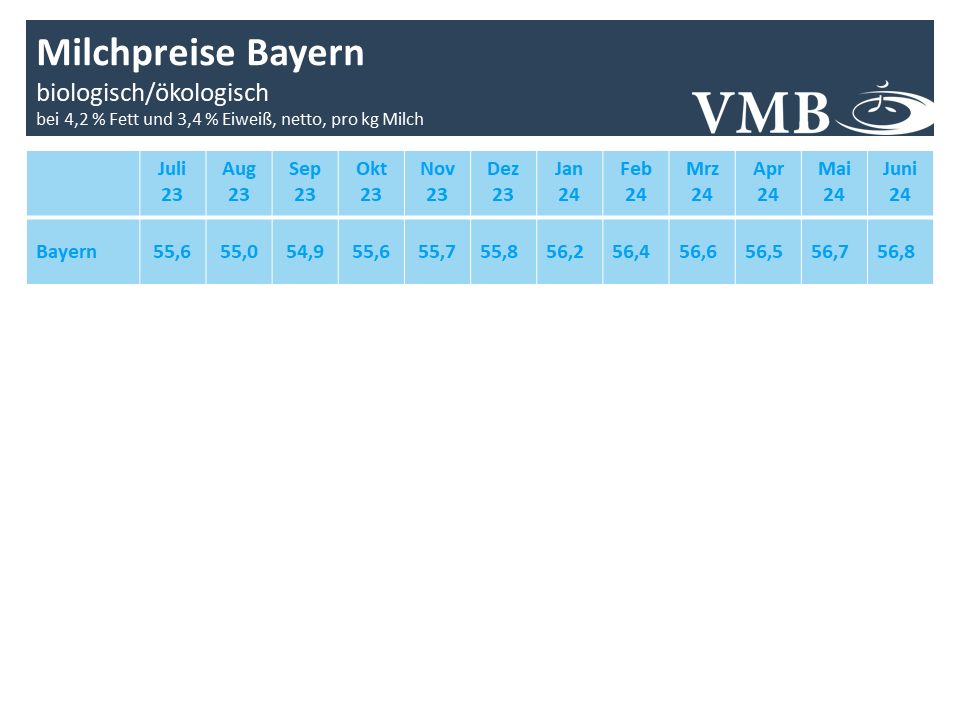 Die Auszahlungspreise für ökologisch erzeugte Milch entwickelten sich im Juni unverändert bis leicht fester. Im Mittel errechnete der VMB für Bayern einen Milchpreis von 56,8 Cent/kg Milch (4,2 % Fett, 3,4 Eiweiß, netto), was einen moderaten Aufschlag von 0,1 Cent/kg Milch zum Vormonat bedeutet. Das Ergebnis aus dem Vorjahresmonat wurde weiterhin verfehlt, der Rückstand reduzierte sich jedoch auf 0,8 Cent/kg Milch.