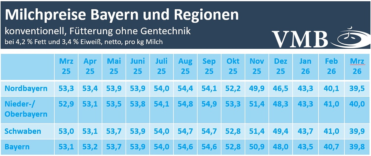 Der Verband der Milcherzeuger in Bayern (VMB) hat in der aktuellen Erhebung einen Milchauszahlungspreis von durchschnittlich 39,8 Cent/kg Milch (bei 4,2 % Fett, 3,4 % Eiweiß, netto ab Hof bei Haltungsstufen 2 falls, ausgewiesen) ermittelt. Der Rückgang gegenüber dem Februar hatte sich auf 0,9 Cent/kg abgeschwächt. Die bayerischen Milchauszahlungspreise erreichten somit den niedrigsten Stand seit November 2021.