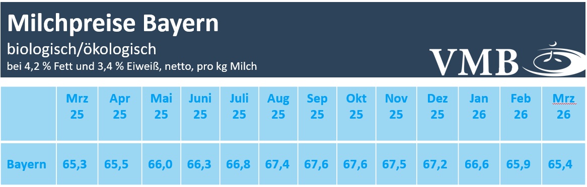 Zu Ende des ersten Quartals setzte sich die schwächere Entwicklung bei den Auszahlungsleistungen für Biomilch in kleinen Schritten fort. Im aktuellen Ergebnis der VMB-Milchpreiserhebung lag der durchschnittliche Biomilchpreis in Bayern bei 65,4 Cent/kg Milch (bei 4,2 % Fett, 3,4 % Eiweiß, netto ab Hof), was zum Vormonat einen Rückgang von 0,5 Cent/kg bedeutet. Von Januar bis März errechnet sich nach den stetigen leichten Korrekturen ein Preisrückgang von 1,1 Cent/kg. Beim Vergleich zum Vorjahresmonat liegen die Milchpreise im März gleich auf.