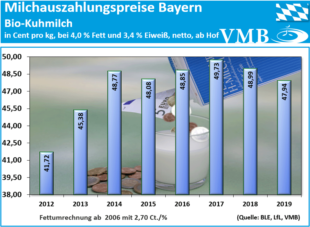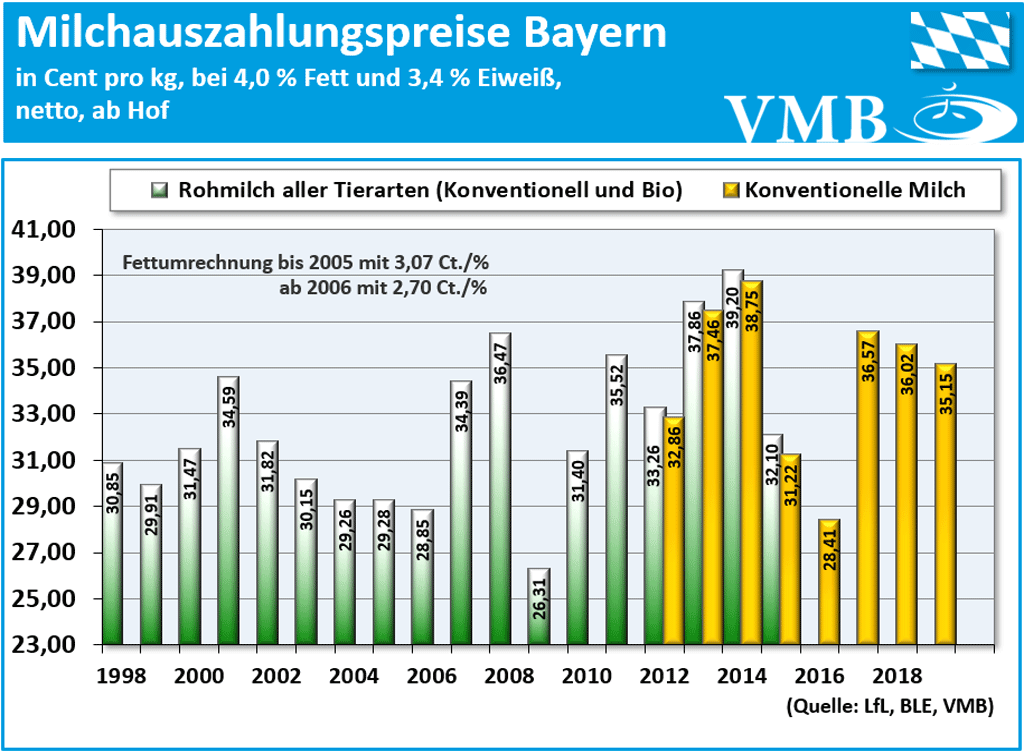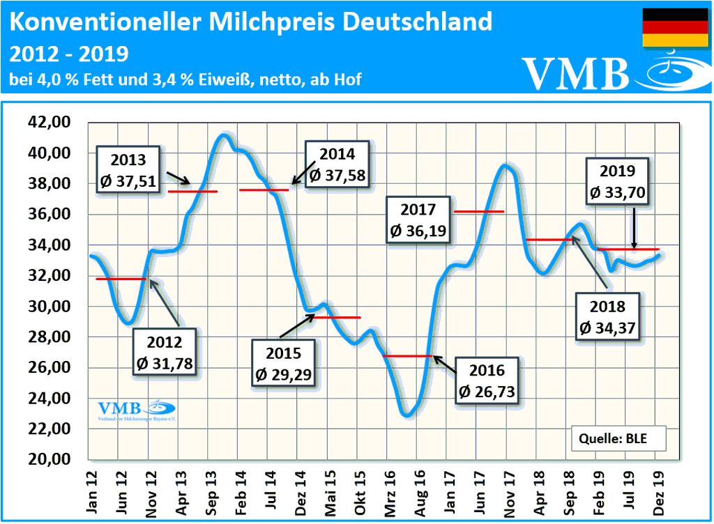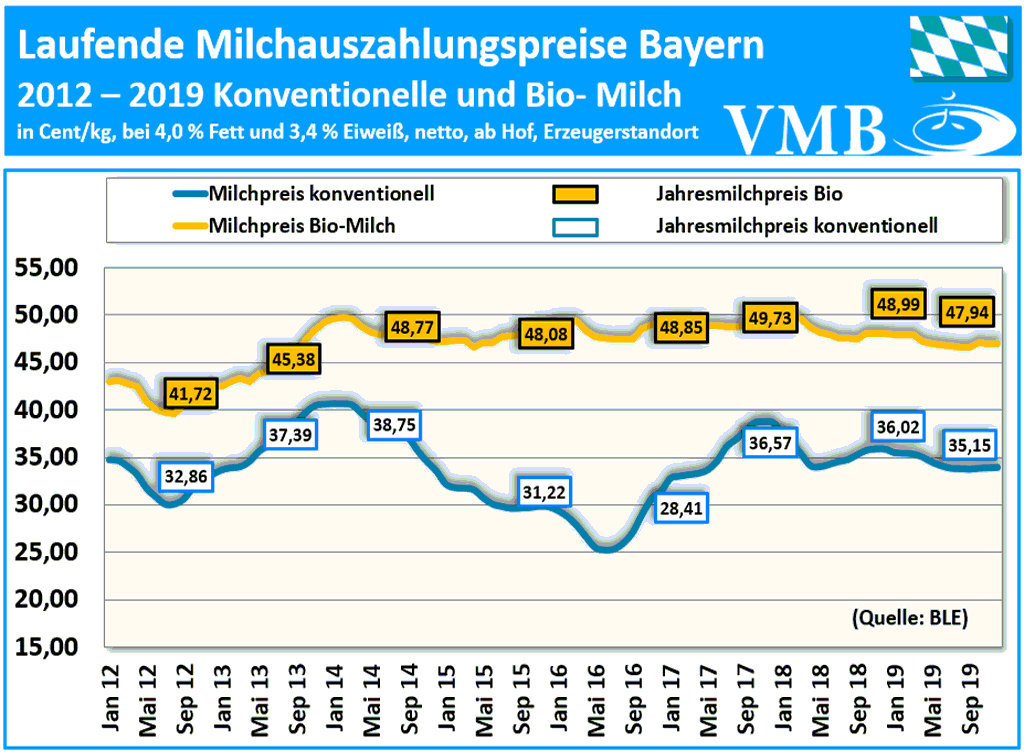 Im Bundesgebiet liegt der durchschnittliche Jahresmilchpreis 2019 bei 33,70 (2018: 34,37) Cent pro Kilogramm Milch und hat damit zum Jahresmilchpreis 2018 um 0,67 Cent pro Kilogramm verloren. Wie bereits im vergangenen Jahr wurde, im Vergleich mit den anderen Bundesländern, in Bayern erneut wieder beinahe der höchste Milchpreis ausbezahlt.