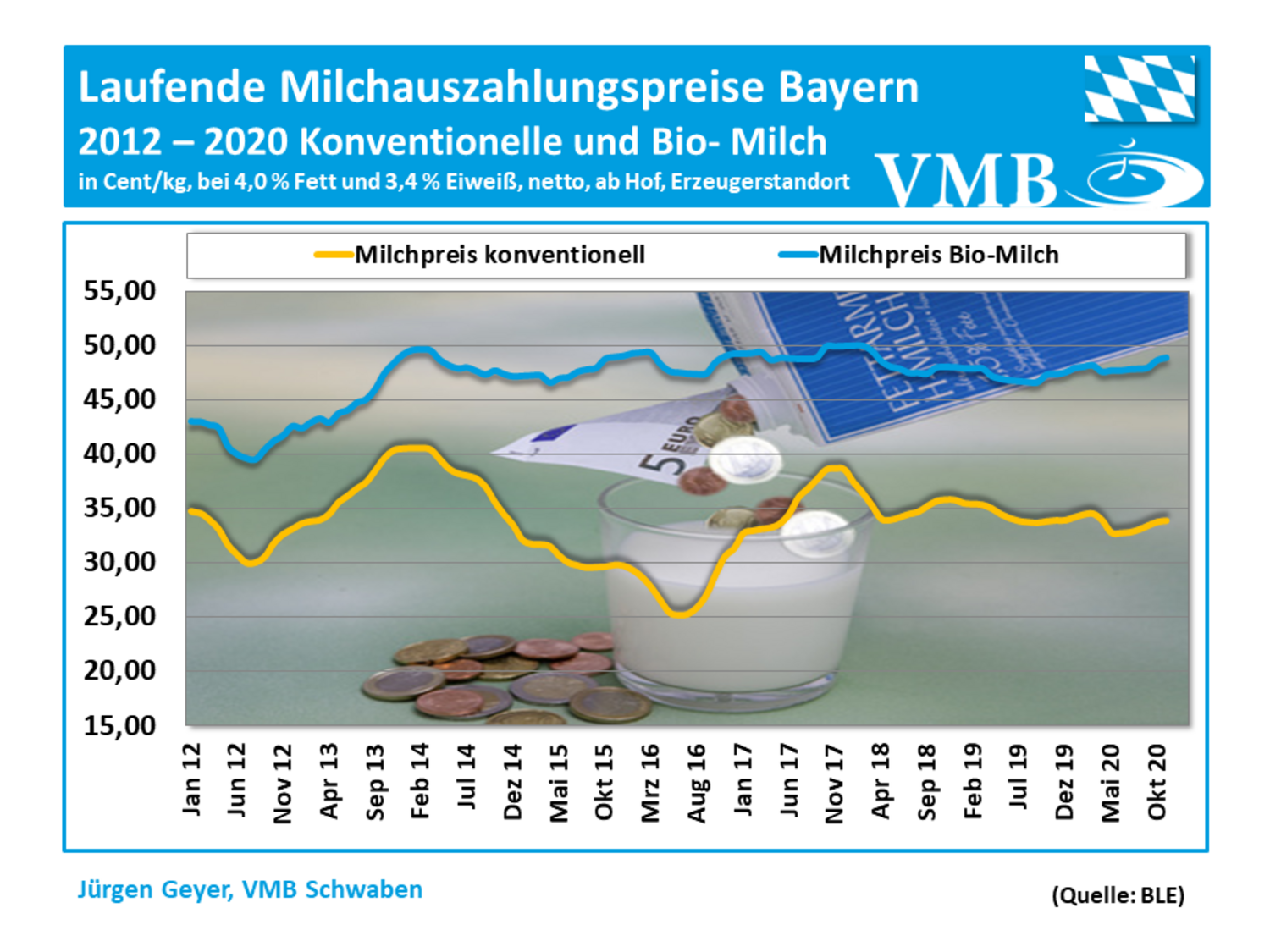 Die Corona-Krise 2020 hat die Märkte teils stark bewegt und zu heftigen Marktturbulenzen geführt. Generell war der Agrarsektor auch davon betroffen. Mitunter verlor der konventionelle Milchmarkt an Position und hatte zeitweise mit Absatz- aber auch mit Preisrückgang zu kämpfen. Das Biosegment konnte in dieser Zeit jedoch Erhöhungen erreichen. Während des Lockdowns im Frühjahr stieg der Verkauf von Bio-Milchprodukten zügig an. Auch nach Beendigung der Pandemie-Beschränkungen blieb die Nachfrage gegenüber dem Vorjahr auf einem stetig guten Niveau, so dass sich die Verkaufspreise verbesserten. Demzufolge erhöhte sich der Milchpreis von Januar bis zum Dezember um gut 0,8 Cent (Anmerkung: Saisonabschläge nicht gewertet!) auf 48,75 Cent pro Kilogramm Milch. Nach amtlicher Erhebung wird der bayerische Jahrespreis 2020 von Biomilch daher mit zirka 48,70 Cent um etwa 0,75 Cent höher liegen als zum Vorjahr mit 47,94 Cent/kg (4,0 % Fett, 3,4 % Eiweiß, netto ab Hof/kg).