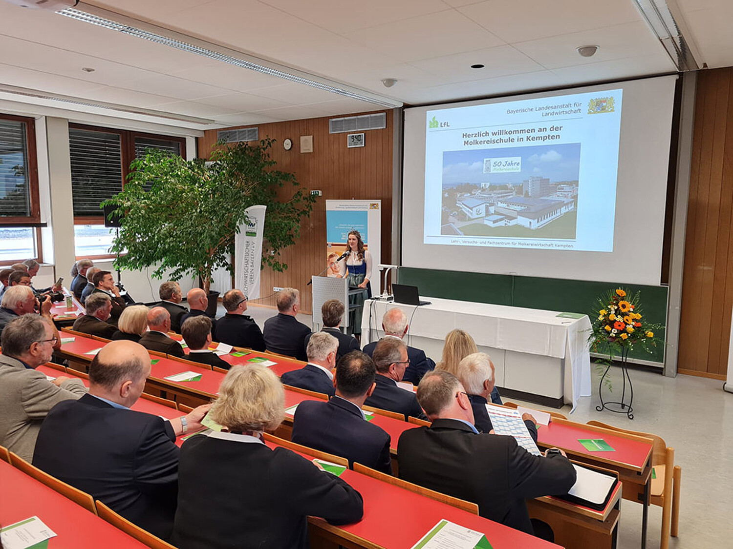 Bild oben: Die Bayerische Milchprinzessin Philomena Mögele bei ihrer Rede anläßlich des 50-jährigen Bestehens der Molkereischule in Kempten.