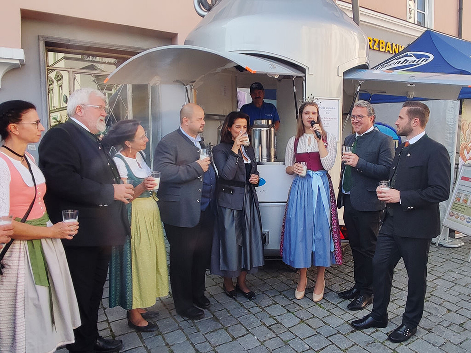 Bild oben: Landwirtschaftsministerin Michaela Kaniber (Mitte) zusammen mit Milchprinzessin Philomena Mögele (rechts von Frau Kaniber) und Stv. VMB-Vorsitzendem und BBV Kreisobmann Josef Andres (links von Frau Kaniber) mit weiteren prominenten Besuchern