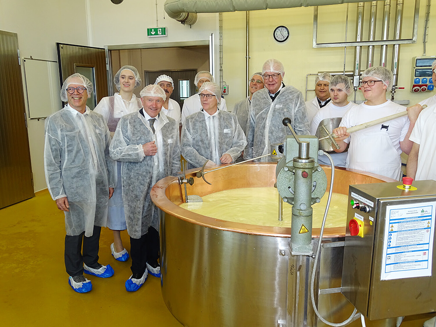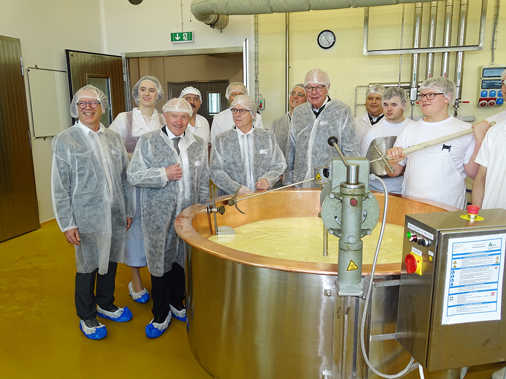 Im Anschluss an den offiziellen Teil zeigte der Leiter der LVFZ, Dr. Tobias Langer, auf einem Rundgang durch die Molkereischule den anwesenden Gästen verschiedene Stationen, die die Auszubildenden in ihrer Ausbildung durchlaufen. An einer Station zeigten Auszubildende das Schneiden einer dickgelegten Käsereimilch in einem Kupferkessel.