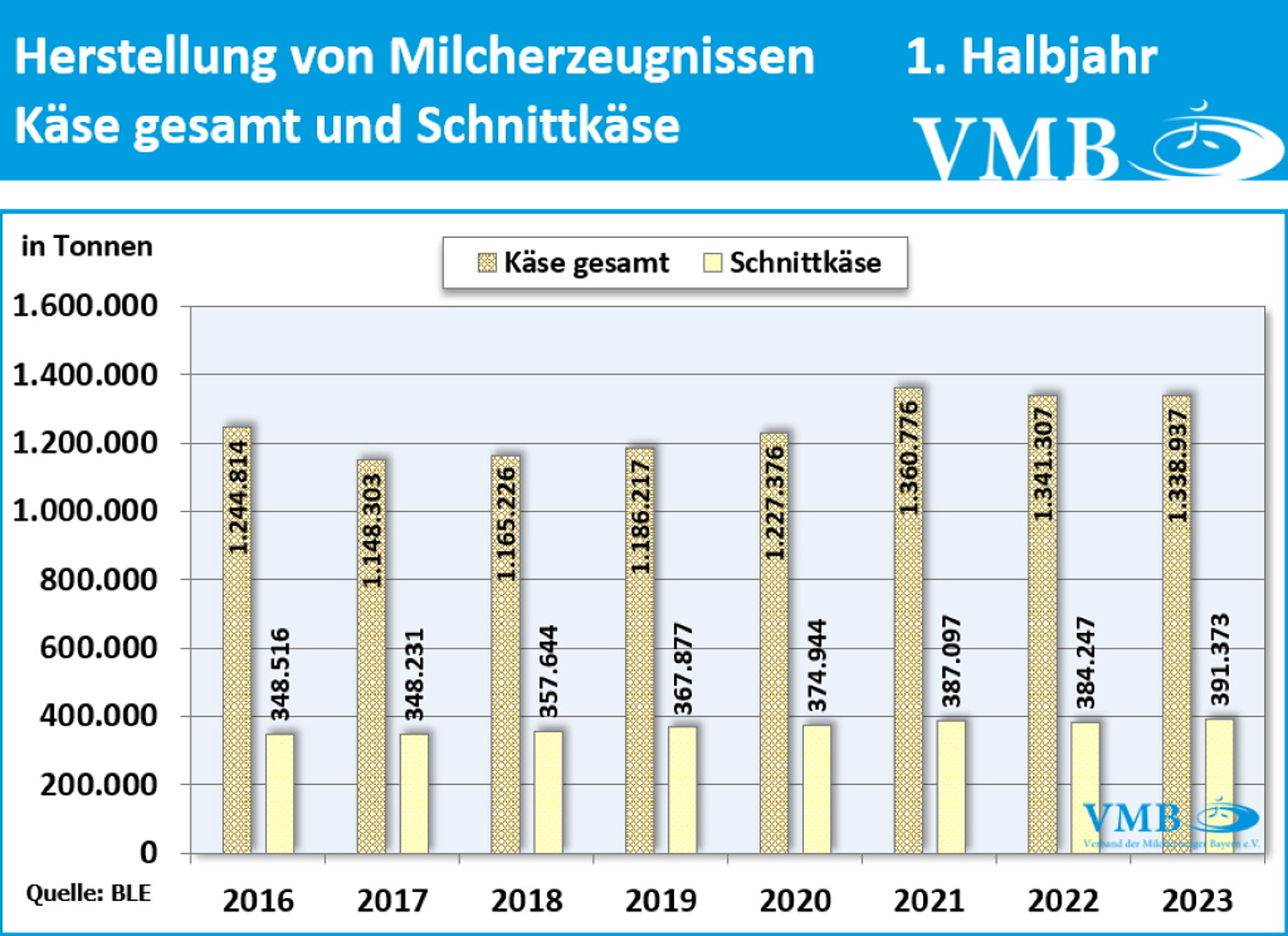Für das erste Halbjahr 2023 ergaben sich einige Produktionsausweitungen bei einigen Segmenten durch das angestiegene Milchaufkommen in Deutschland von über 300 Millionen Kilogramm Milch in sechs Monaten. Die Trockenmilcherzeugung hat erneut zugelegt, Konsummilchprodukte haben wieder nachgelassen und das Milchäquivalent stärkste Segment Käse blieb vorerst mehr oder weniger unverändert, allerdings mit Präferenzen zu Schnitt- und Pasta Filatakäse und die Produktionshöhe an Butter wurde vorläufig auch ausgedehnt, obwohl derzeit im Lebensmitteleinzelhandel (LEH) die Kunden etwas weniger bei Käse und Butter zugreifen.