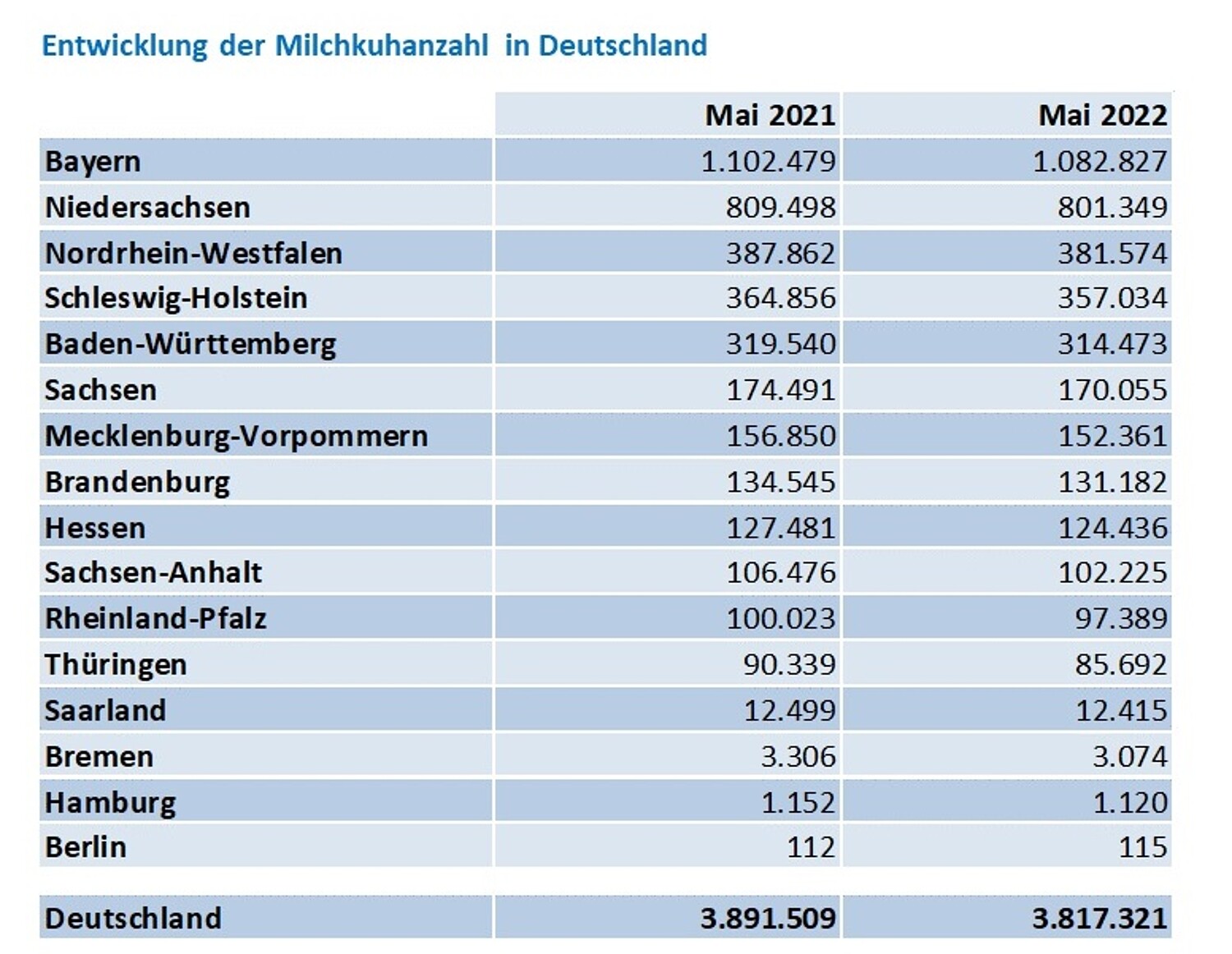 Im gesamten Bundesgebiet gesehen sind die meisten Rückgänge der Milchkuhhaltungen vor allem im süddeutschen Raum (Bayern -4,3 Prozent, Baden-Württemberg -4,8 Prozent) sowie Thüringen -4,4 % zu verzeichnen. Aber auch in der den anderen Bundesländern (Ausnahme Stichtag 3. Mai Saarland) hält der Rückgang der Milchviehhaltung weiter an.