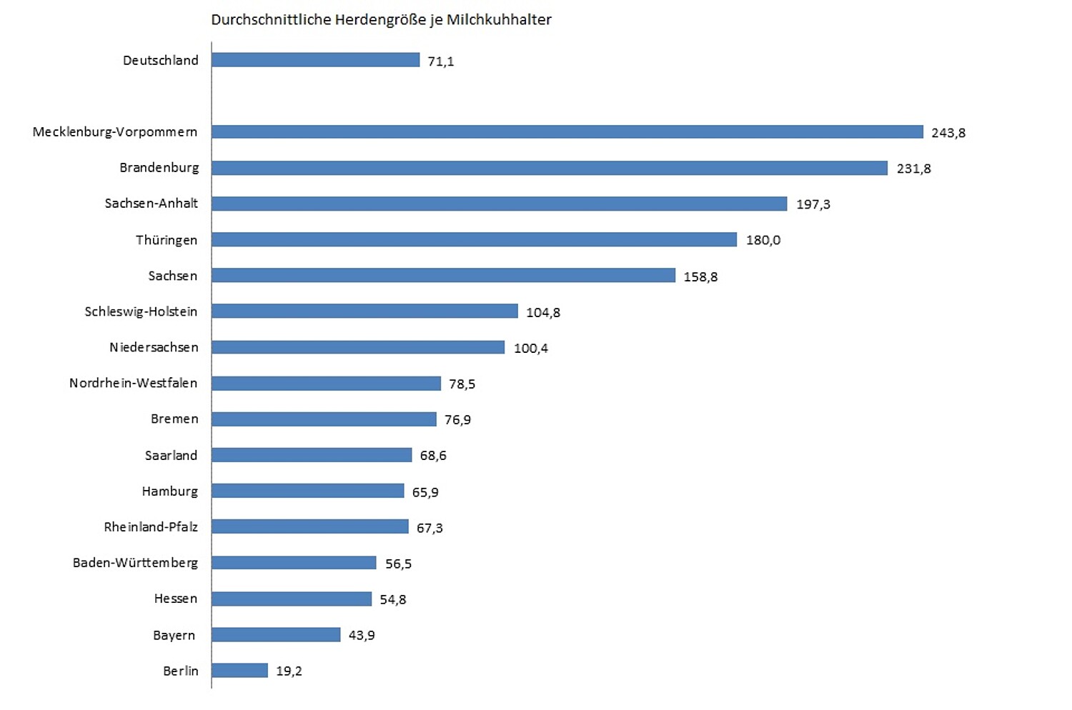 Die Zahl der Milchkühe hat sich ebenfalls zum Vorjahr reduziert (-1,9 Prozent). Hier sind die größten Rückgänge in Sachsen-Anhalt (-4,0 Prozent) und Thüringen (-5,1 Prozent) zu verzeichnen. Hinsichtlich der Herdengröße pro Halter gibt es keine wesentlichen Veränderungen in den einzelnen Bundesländern.