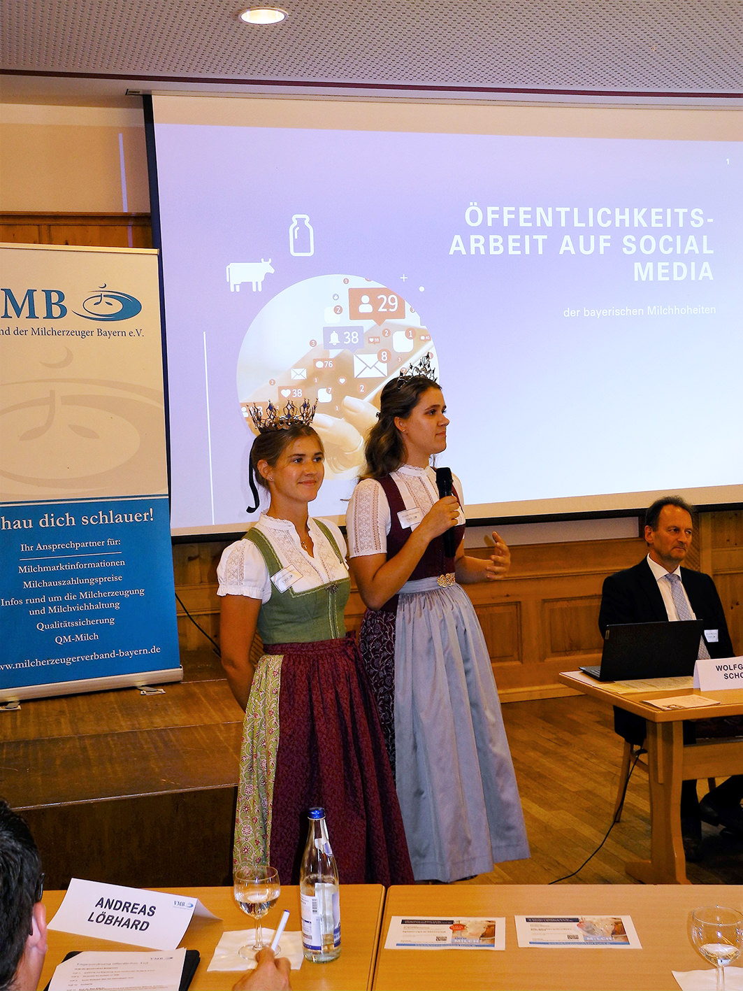 Die beiden beim VMB angestellten und zusammen mit dem Kooperationspartner milch.bayern e.V. im Einsatz für die bayerische Milch stehenden Milchhoheiten, Milchkönigin Veronika Gschossmann und Milchprinzessin Philomena Mögele, brachten dann auch noch einen besonderen Farbtupfer in die Veranstaltung. Sie berichteten über ihre Aktivitäten auf den von ihnen bespielten Social Media Kanälen Facebook, Instagram und seit Mitte diesen Jahres auch Tik Tok. Mit kurzen und knackigen Botschaften aus ihren zahlreichen Einsätzen oder auch von der praktischen Arbeit auf den elterlichen Betrieben erreichen die beiden Hoheiten vor allem die Altersgruppe bis 25 Jahre, die im Auditorium der VMB-Veranstaltung nicht anzutreffen war.