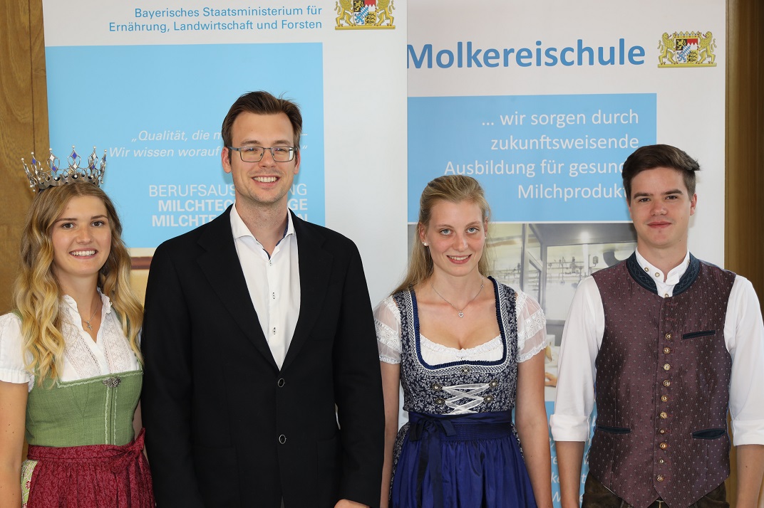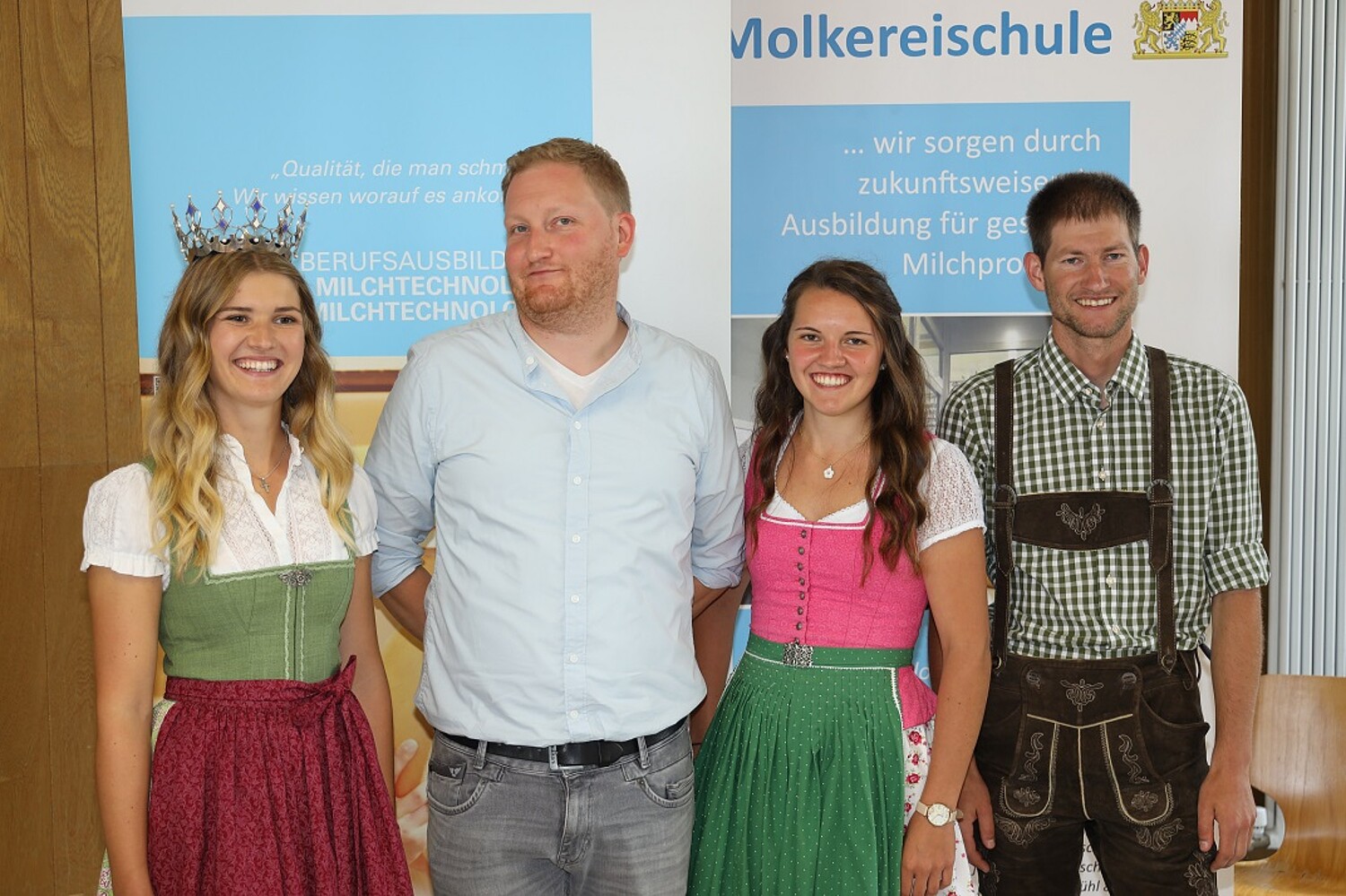 Bild oben: Bayerische Milchkönigin Veronika Gschoßmann (links) freut sich mit den besten Molkereitechniker:innen Tobias Thiele, Barbara Schmid und Anton Wegertseder