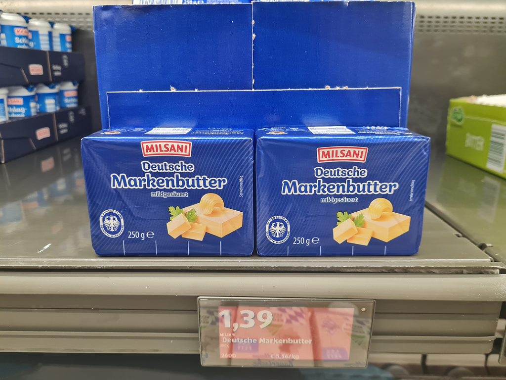 Mit dem neuen EVP von 1,39 Euro hat der Butterpreis in den vergangenen 7 Monaten einen fulminanten Absturz erlebt: Während im Boomjahr 2022 der Verbraucher für den 250-g-Ziegel ab Mai 2,29 Euro für die Eigenmarke bezahlen musste, stellte auch infolge der gegenläufigen Markt- und Absatzentwicklung Branchenprimus Aldi am 22. Dezember vergangenen Jahres mit der Rücknahme des EVP auf 1,99 Euro/250 g die Weichen in eine andere Richtung. Ende Januar erfolgte nochmals eine massive Anpassung auf 1,59 Euro, seit Ende April hatte nun die Marke von 1,45 Euro/250 g Bestand! Und diese jüngste Anpassung wurde nicht nur für die Deutsche Markenbutter (mildgesäuert) vollzogen. Auch die Eigenmarken Süßrahmbutter, Biobutter und Weidebutter wurden um 6 Cent/250 g reduziert. Bei der Bergbauernbutter der Eigenmarke wurden sogar 10 Cent gekappt!