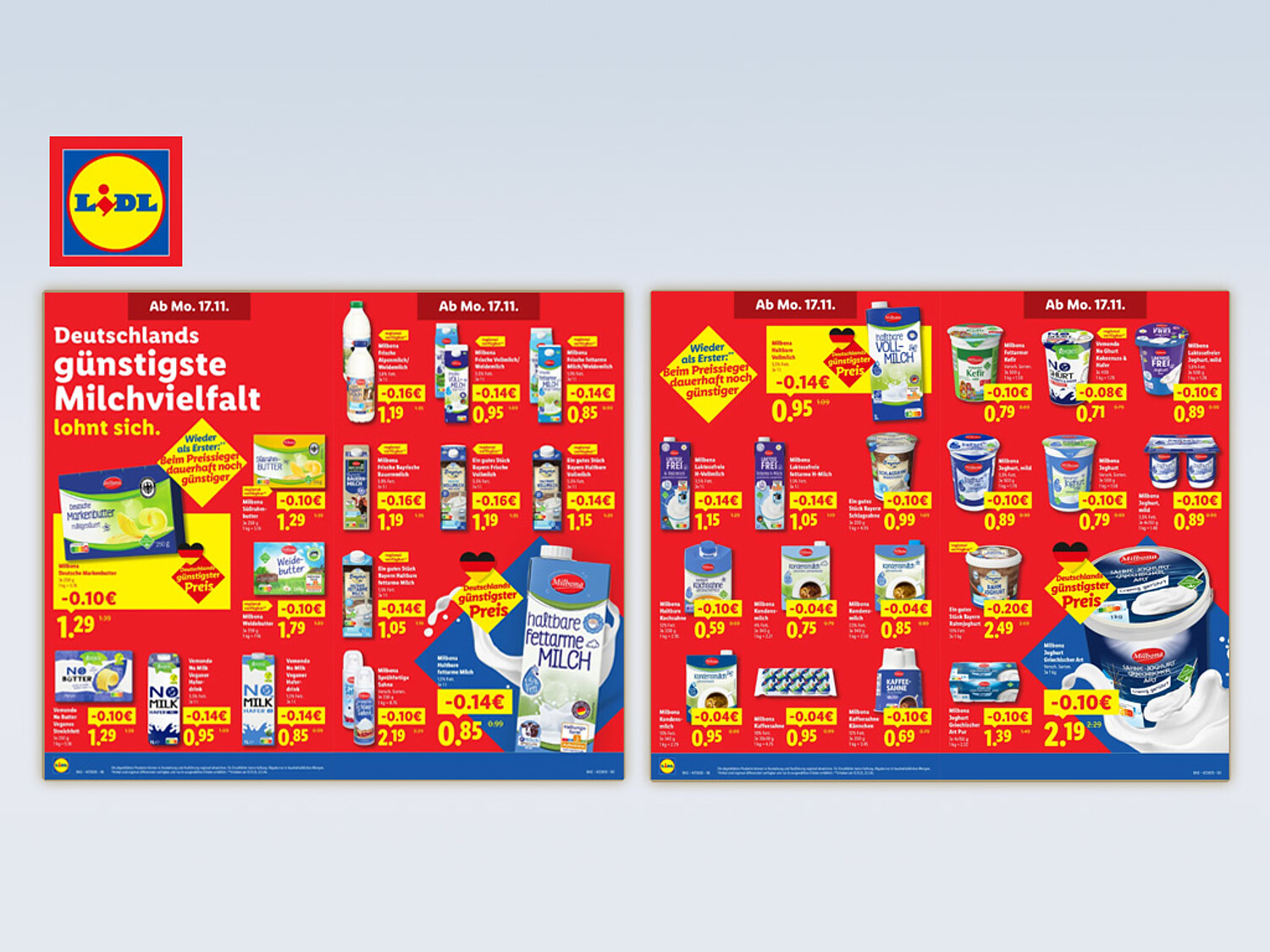Die von Aldi am Donnerstag vergangener Woche angekündigte und am darauffolgenden Freitag wirksame Preissenkungswelle für 15 Milchprodukte der "weißen Linie" war noch gar nicht richtig im Kühlregal angekommen, holte Widerpart Lidl am Sonntag bereits zu einem massiven Gegenschlag aus: Für die nahezu gesamte restliche "weiße Linie" wurden die Endverbraucherpreise (EVP) abgesenkt. Betroffen waren auch die medial viel beachtete Konsummilch und nochmal, quasi als "Sahnehäubchen" des Gegenschlages, die Deutsche Markenbutter, Eigenmarke "Milbona".