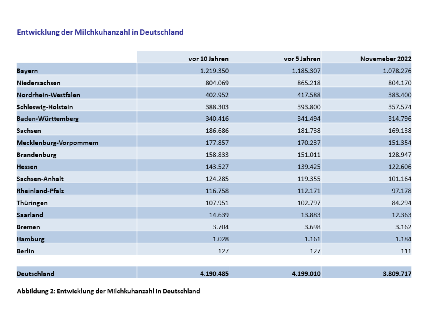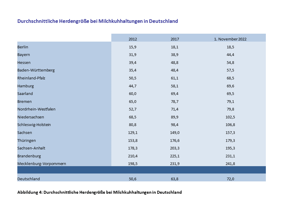 Wie Abbildung 4 zu entnehmen ist, ist Bayern weiterhin noch eines der Bundesländer mit kleinstrukturierter Milchviehhaltung. Je Halter werden im Durchschnitt 44,4 Milchkühe gehalten mit einem leichten Anstieg von 3 Prozent zum Vorjahr mit durchschnittlich 43,1 Milchkühen je Halter. Der Bestand der Kälber und Jungrinder (bis einschließlich 1 Jahr) in Deutschland umfasste zum 3. November 2022 insgesamt 3.307.667 Tiere, in Bayern 834.701 Tiere.