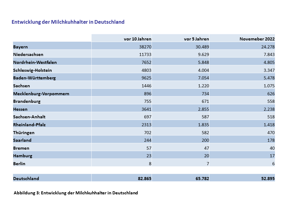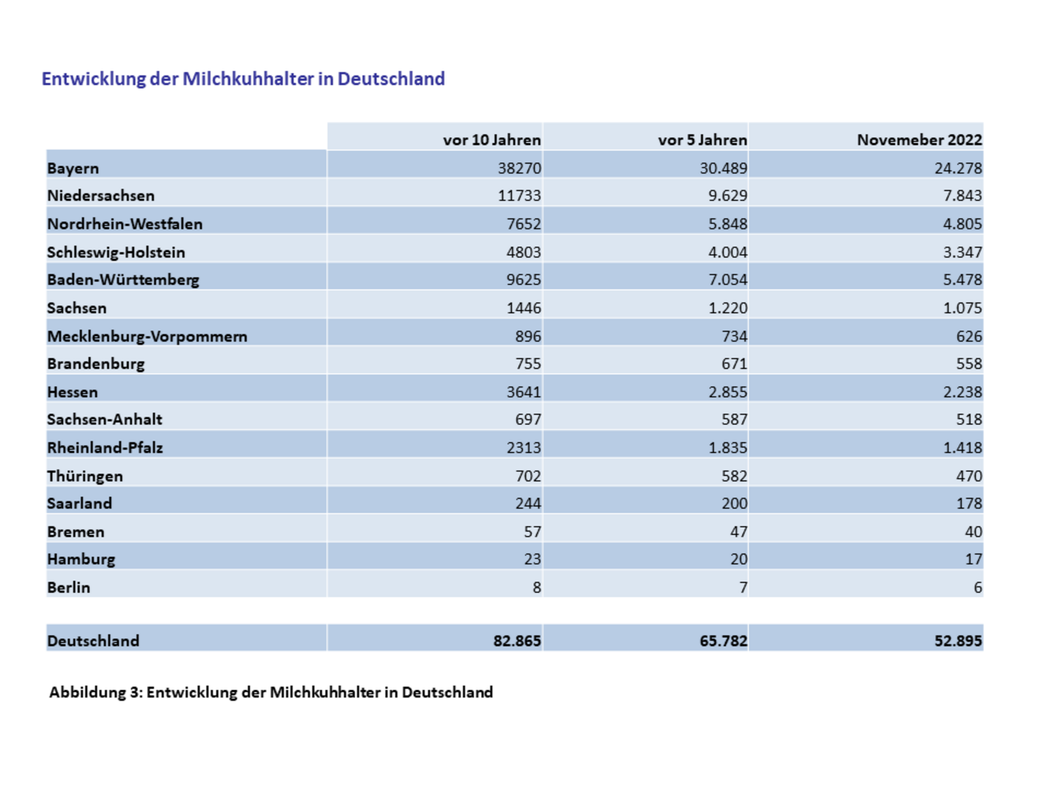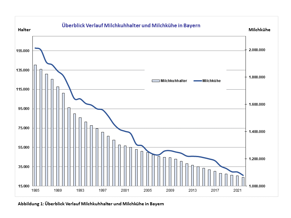 Auf Bayern bezogen ist festzuhalten, dass sich die Rinderhaltungen gegenüber dem Vorjahr (ebenfalls Stichtag 3. November) von 40.580 Haltungen und 2,885 Millionen Tieren auf 39.815 Haltungen (-1,88 Prozent) mit nur noch knapp 2,867 Millionen Tieren (-0,62 Prozent) weiterhin reduzierten. Der Rückgang fällt dabei nicht so stark aus wie in 2021.