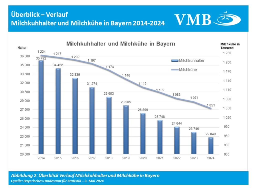 Den größten Anteil von 38,1 Prozent am Rinderbestand in Bayern haben im Jahr 2024 weiterhin die Milchkühe mit insgesamt 1.050.809 Tieren (siehe Abb. 1). Der entsprechende Bestand ist im Vergleich zum Vorjahr von einem Rückgang betroffen, der bei 20.086 Tieren oder 1,9 Prozent liegt. Dem allgemeinen Trend in der Landwirtschaft folgend geht die Zahl der Milchkuhhaltungen mit einem Minus von 3,8 Prozent (-897 Haltungen) stärker zurück als der entsprechende Bestand an Tieren. Damit zählt Bayern zum 3. Mai 2024 noch 22.849 Milchkuhhaltungen (siehe Abb. 2).Bayern ist weiterhin eines der Bundesländer mit recht kleinstrukturierter Milchviehhaltung, obwohl die durchschnittliche Zahl der Milchkühe je Haltung im letzten Jahrzehnt langsam aber stetig ansteigt. Gegenüber dem Vorjahr hat sich die Zahl der Milchkühe je Haltung um ein Tier auf 46 Milchkühe erhöht.
