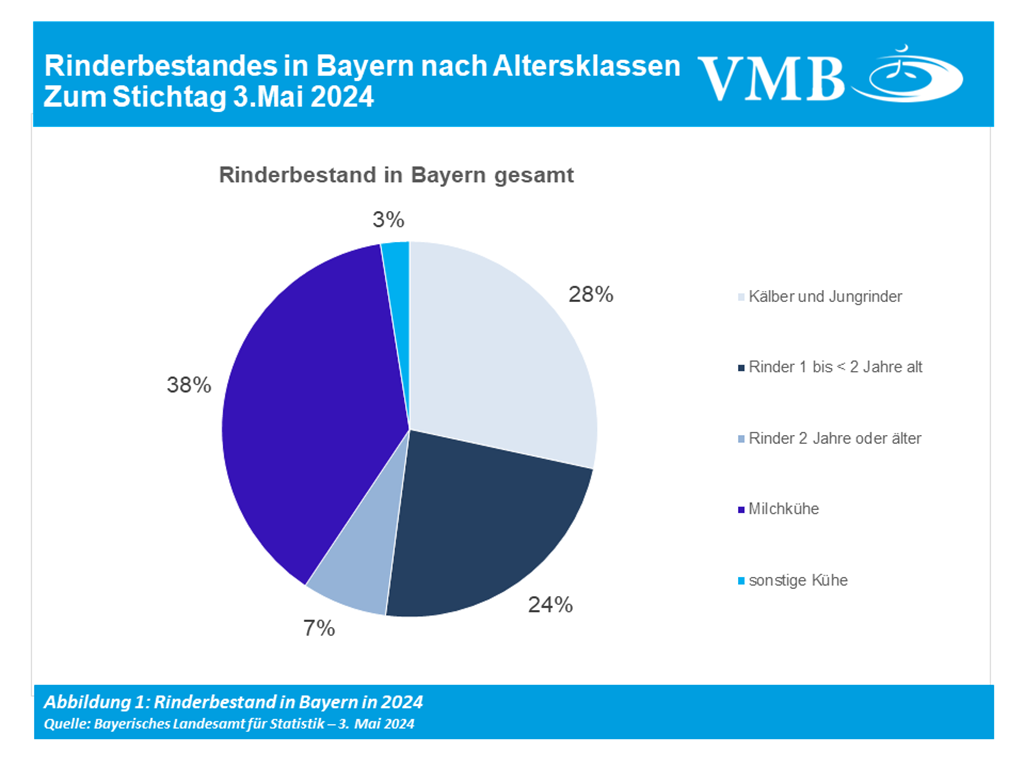 Der Bestand der Kälber und Jungrinder (bis einschließlich 1 Jahr) in Bayern umfasste zum 3. Mai 2024 insgesamt 781.710 Tiere und ist damit um 3,1 Prozent rückläufig. Der Bestand an Rindern im Alter von einem bis unter zwei Jahren sinkt ebenso. Er geht um 4,9 Prozent auf 652.426 Tiere zurück. In dieser Kategorie den größten Anteil stellen mit 72,3 Prozent (471.497 Rinder) die weiblichen Tiere dar. Davon werden wiederum 86,2 Prozent (406.456 Rinder) zur weiteren Zucht und Nutzung vorgesehen und 13,8 Prozent (65.041 Tiere) zur Schlachtung.Den geringsten Anteil der Rinder stellen die Tiere im Alter von zwei Jahren oder älter dar, die keine Milchkühe sind. Von den 201.605 Rindern sind 9,8 Prozent (19.772 Tiere) Bullen und Ochsen. 90,2 Prozent dieser Altersgruppe sind weibliche Tiere (165.937 Rinder). Von ihnen wird mit 91,3 Prozent der Großteil der Tiere (165.937 Tiere) für die Zucht und Nutzung vorgesehen und lediglich 8,7 Prozent (15.896) sind zur Schlachtung eingeplant.