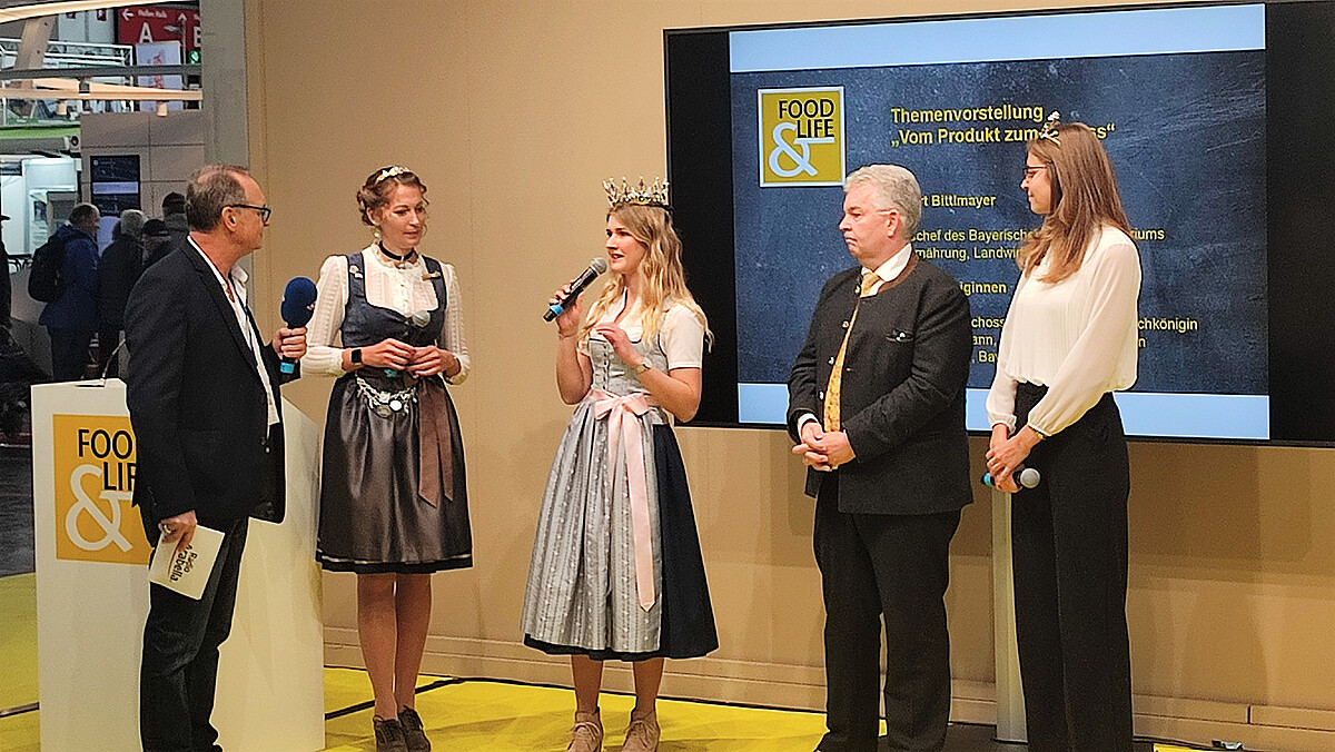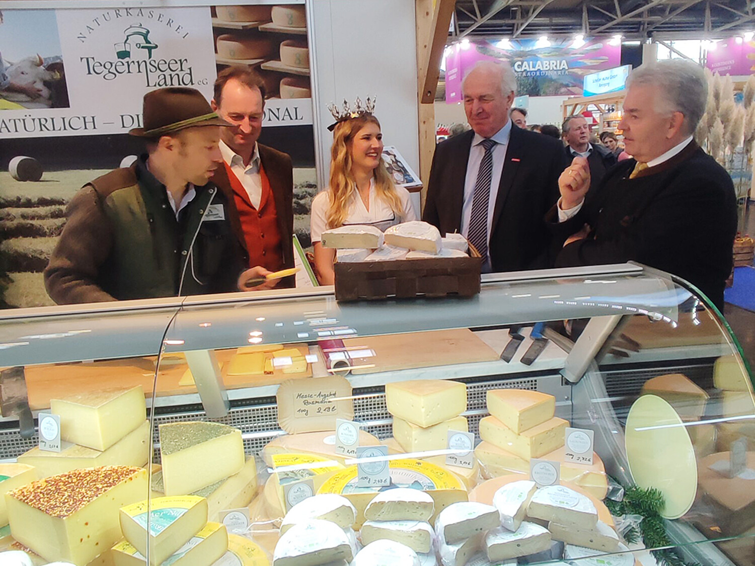 Am 30.11. wurde in München die Food & Life, - Deutschlands größter Treffpunkt für Essen, Trinken und Genießen - mit mehr als 200 Ausstellern eröffnet. Noch bis zum 04.12.2022 hat die Food & Life ihre Tore geöffnet hat. Dabei stehen vor allem kleinere handwerkliche Betriebe und Manufakturen mit ihren regionalen Schmankerln und Spezialitäten im Mittelpunkt des Interesses. Zum Start der Messe hat die Bayerische Milchkönigin Veronika Gschoßmann zusammen mit der Bayerischen Bierkönigin Sarah Jäger, der Fränkischen Weinkönigin Eva Brockmann und dem Amtschef Ministerialdirektor Hubert Bittlmayer die Besucher bei einem Podiumsgespräch eingestimmt, welche verschiedenen Genüsse von Käse, Bier und Wein sie auf der Messe entdecken können. Beim anschließenden Rundgang haben sie sich mit VMB-Vorsitzenden Wolfgang Scholz und Handwerkskammer-Präsident Franz-Xaver Peteranderl am Stand der Naturkäserei Tegernseer Land vom Verkaufsleiter Florian Hauder die Besonderheiten seines Käses erklären lassen. Zum Abschluss gab es für die Milchkönigin noch eine geführte Verkostung mit der Genusskäserei Wiggensbach und der Bayerischen Bierkönigin Sarah Jäger zum Thema „Käseschätze und Bayerisches Bier“