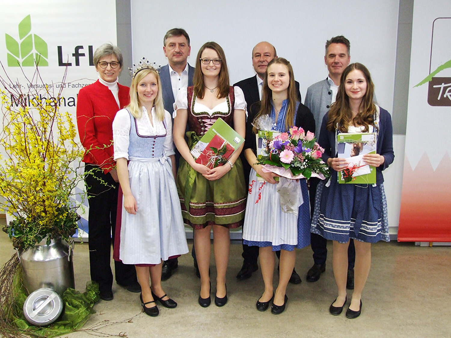 Milchprinzessin Melanie Maier wünschte in ihrem Grußwort den frischgebackenen Absolventen für ihren weiteren beruflichen Werdegang alles Gute. Sie gratulierte zusammen mit Günther Felßner, dem Vorsitzenden des Milchwirtschaftlichen Vereins Franken e. V. und Helmut Leidenberger als Vertreter der Berufsschule, Katharina Rannetsberger (Meggle, Wasserburg) zur besten Abschlussprüfung. Daneben wurden Marina Wiesnet (Burglengenfeld) für die zweitbeste und Lena Mann (Hochland, Schongau) mit der drittbesten Abschlussprüfung ausgezeichnet.