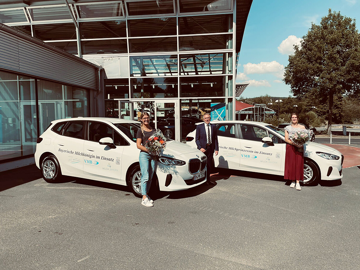Damit die Bayerischen Milchhoheiten Veronika Gschoßmann und Philomena Mögele weiterhin sicher und repräsentativ zu ihren zahlreichen Terminen unterwegs sein können, haben der Verband der Milcherzeuger Bayern e.V. und milch.bayern e.V. die jungen Damen mit zwei neuen BMW Active Tourern ausgestattet. Die Übergabe der neuen „Kutschen“ an die beiden sichtlich stolzen Autofahrerinnen fand vor kurzem in Wunsiedel statt. Auf den Fahrzeugen sind QR-Codes zu den Social-Media-Kanälen aufgebracht, so dass Fans der Bayerischen Milchhoheiten auch gleich von unterwegs aus mit ihnen Kontakt aufnehmen können.